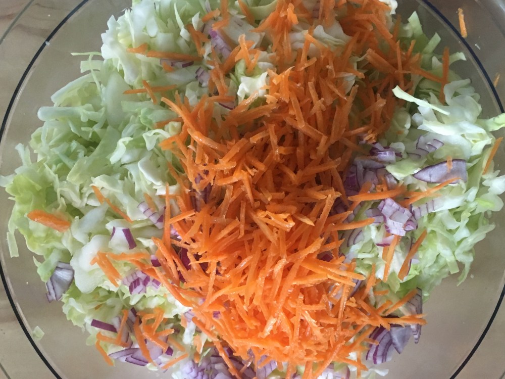 Die Zwiebeln fein würfeln, die Karotte in feine Streifen schneiden bzw. in feine Julienne Streifen hobeln und ebenfals in die Schüssel geben.