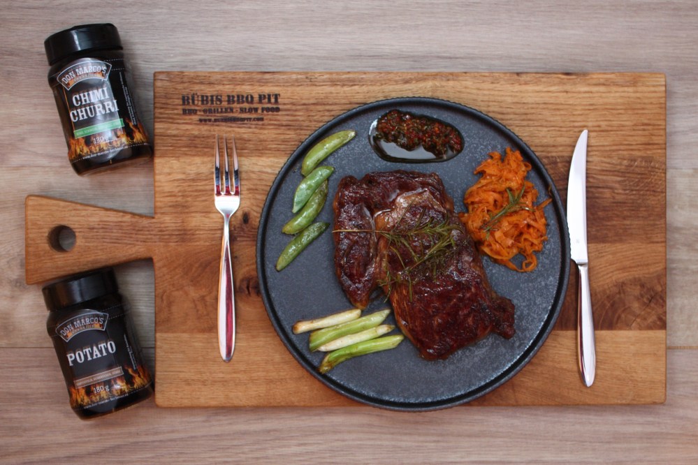 Gestern habe ich im Edeka Markt Altenbernd in Melle, in der Fleischtheke ein wunderbar mamoriertes Stück Entrecôte von der deutschen Färse entdeckt. Ich konnte nicht widerstehen und habe mir ein amtliches Steak von 650g zuschneiden lassen. Zusammen mit ein paar Süßkartoffel-Spaghetti, einigen Zuckerschoten und Don Marcos Cimichurri ist mit wenigen guten Zutaten ein richtig leckerer Teller endstanden. Eigendlich ist das ganke kein Rezept, trotzdem möchte ich euch hier kurz beschreiben, wie ich vorgegangen bin.