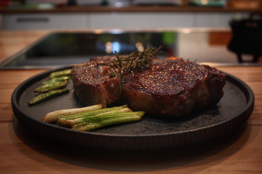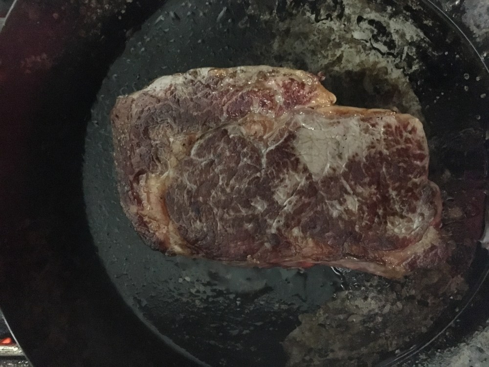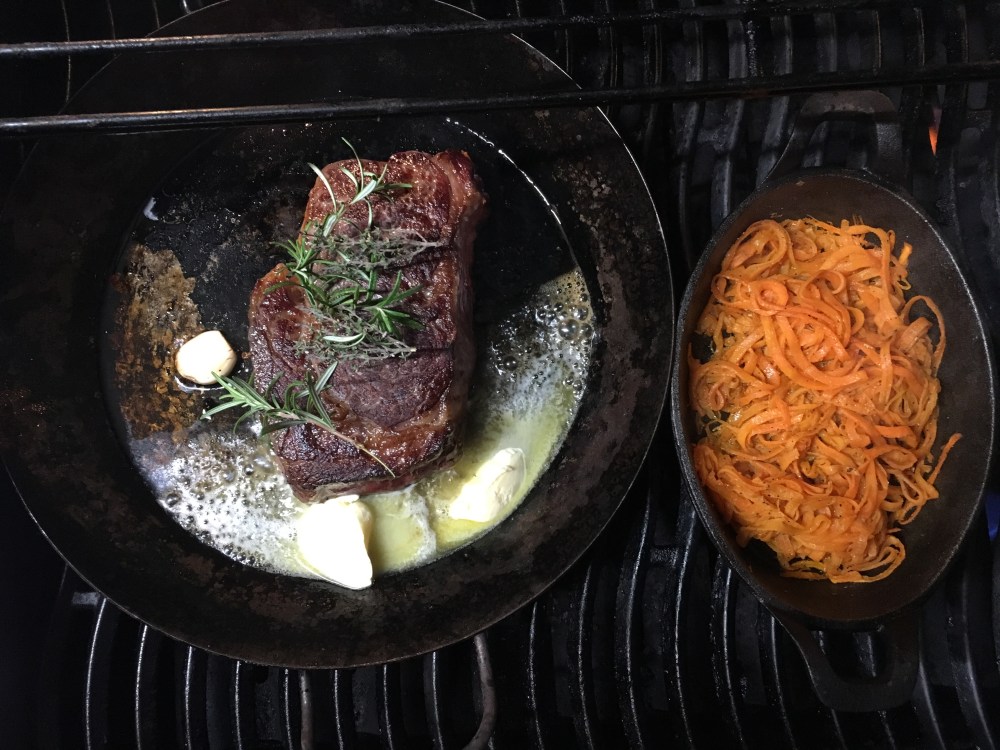 Zubereitet habe ich es dieses Mal in einer Eisenpfanne. Diese wurde auf der Sizzlezone vom Napoleon Grill richtig stark erhitzt und das Steak von jeder Seite 2 Minuten in etwas Öl angebraten, bis sich eine richtig schöne Kruste mit herrlichem Röstaromen gebildet hat.