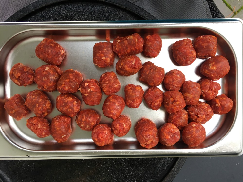 Anschließend die Brühe und die Klöße hinzugeben und bei geschlossenem Deckel ca. 1 Stunde köcheln lassen. Die deftigen Merguez-Klöße verleihen der Suppe beim Kochen zusätzlich Geschmack, auch wenn man sie im nächsten Schritt erst einmal wieder entfernen muss.