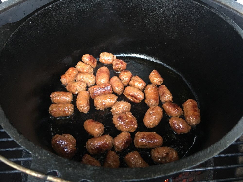 Den Dutchoven vorheizen, die Klöße scharf in etwas Öl anbraten und bei Seite stellen.