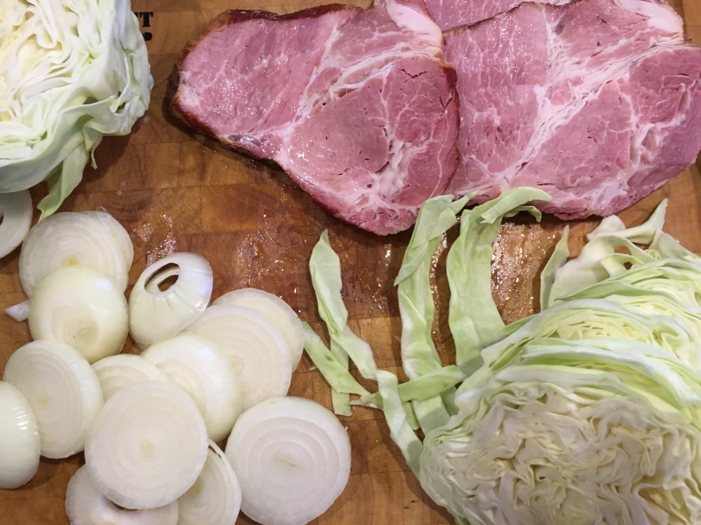 Als erstes werden die Zutaten für das Schichtfleisch vorbereitet. Dazu den Kasselernacken in ca. 1cm dicke Scheiben schneiden, die Zwiebeln schälen und ebenfalls in Scheiben schneiden. Jetzt noch den Spitzkohl halbieren, den Strunk entfernen und Scheiben herunterschneiden.