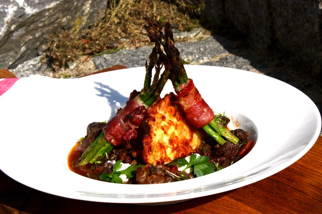 Hier noch ein Tellerbild in der Frühlingssonne. Seviert mit ein paar Tupfern Schmand und ein paar Blättern Petersilie macht es auch optisch richtig was her. Der Geschmack, ein Träumchen!! So bekommt man es nur in einem Dutchoven hin.