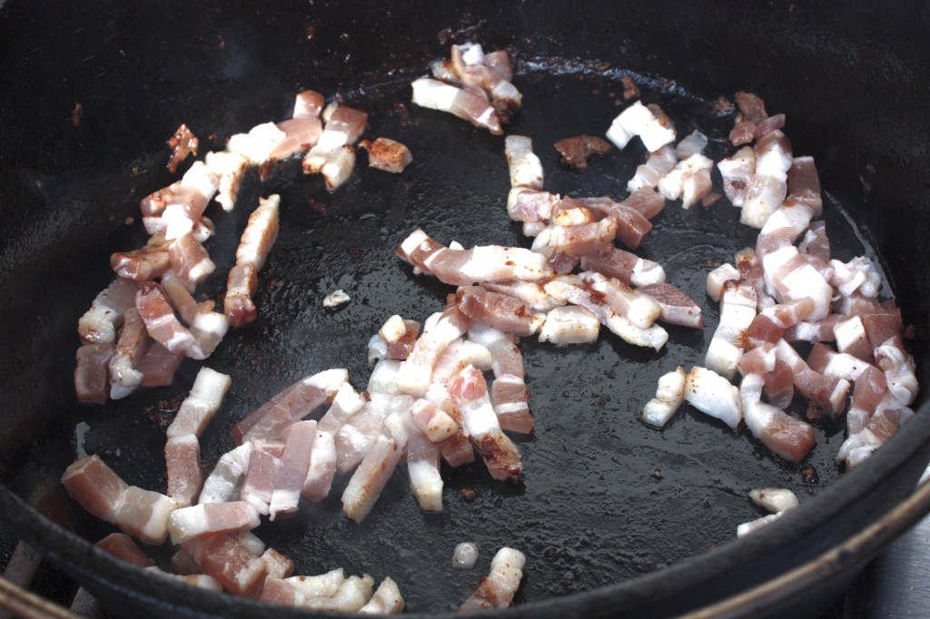 Anschließend das Fleisch aus den Topf nehmen, den Bacon hineingeben und auslassen, bis er knusprig ist.