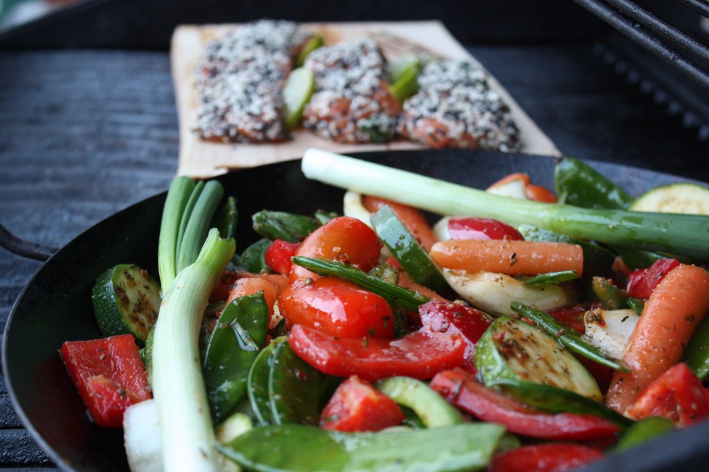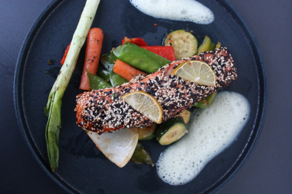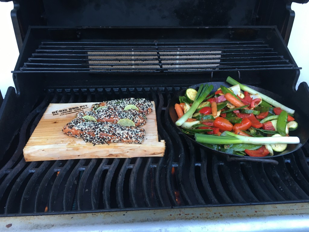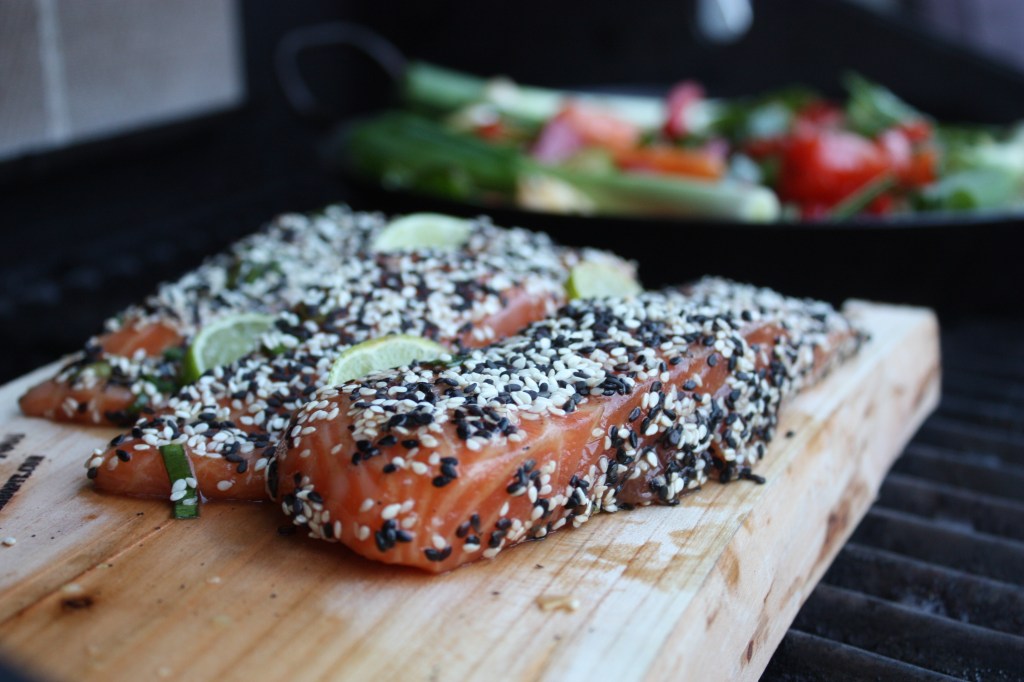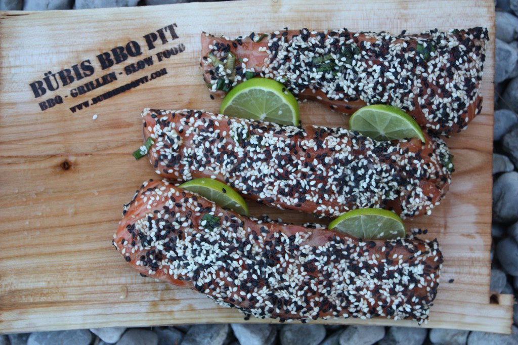 Lachs auf einer Buchenplanke gegart, landet bei uns häufiger auf dem Grill. Klassisch mit Gewürzen und Zucker bestreut und Limetten gespickt ist das schon eine leckere Angelegenheit. Aber dieses mal wollte ich eine andere Variante ausprobieren und habe ihn vor dem Grillen pikant asiatisch mariniert und anschließend in Sesam gewälzt. Gegart wurde er anschließend auf einer Kirschholzplanke im Napoleon Gasgrill. Dazu gab es knackiges Grillgemüse und einen Wasabischaum. Der absolute Knaller, nicht nur optisch..