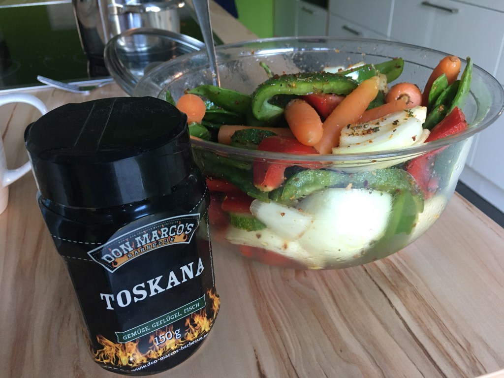 Das Gemüse gründlich waschen und grob würfeln. Die Möhren kurz in Salzwasser blanchieren, mit kaltem Wasser abschrecken und zum restlichen Gemüse geben. Einen guten Schuss Olivenöl darüber geben und mit Don Marcos Toskana Rub und etwas Salz würzen.
