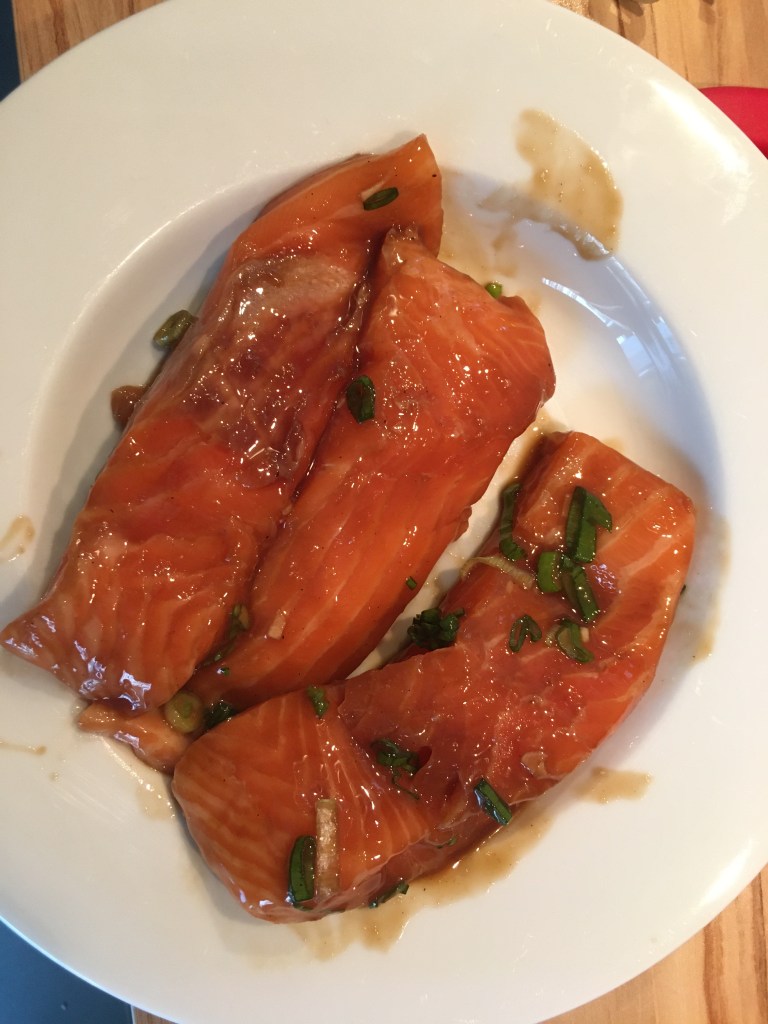 Die Zutaten für die Marinade gut verrühren und die in Ringe geschnittenen Frühlingszwiebel und den gehackten Knoblauch hinzugeben. Den Lachs zusammen mit der Marinade in einen Gefrierbeutel geben, verschließen und vorsichtig durchkneten, damit die Marinade gut verteilt wird. Den Beutel für 2 Stunden in den Kühlschrank legen.