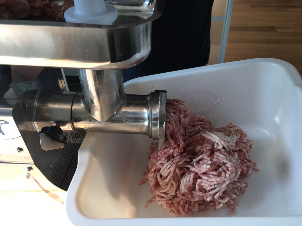 Nun das Ganze durch den Wolf geben und anschließend gut durchkneten. Anschließend das Brät noch ein zweites Mal durchlassen.
