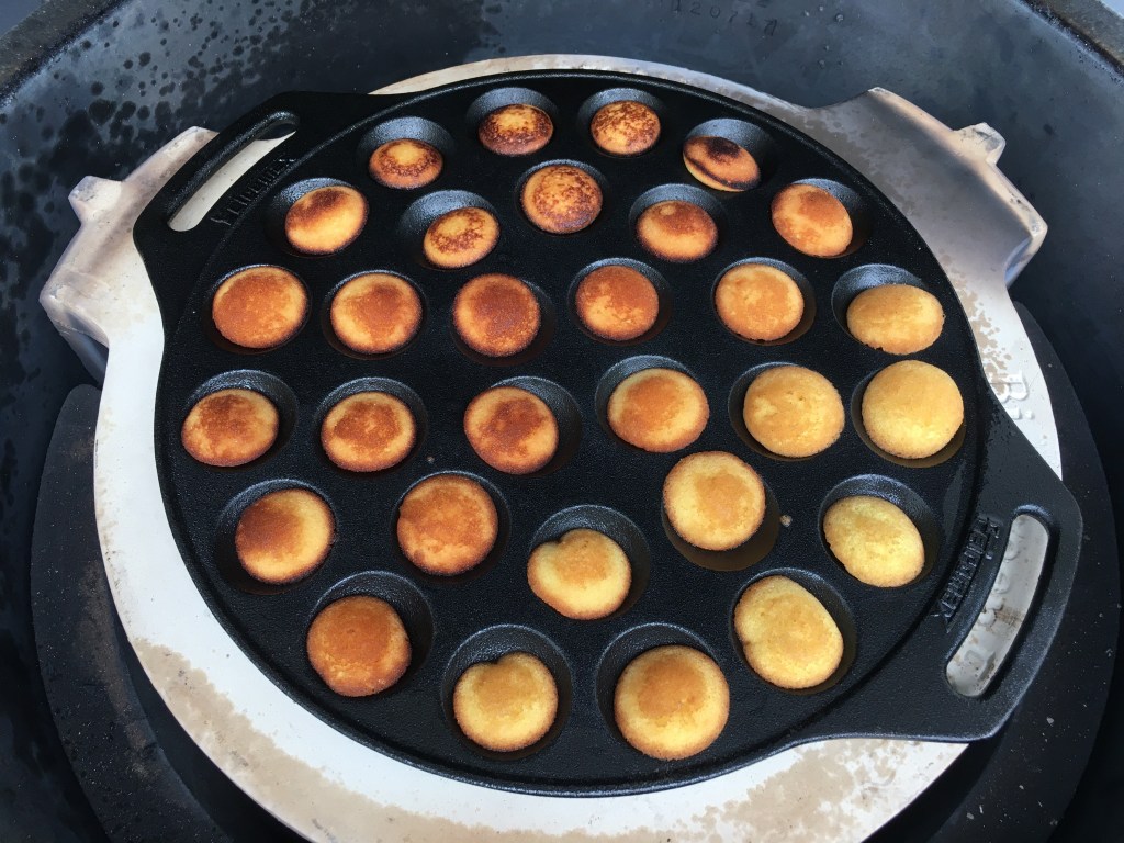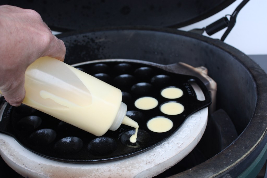 Die Poffertjes-Pfanne bei mittlerer Hitze im Grill erhitzen, dann mit Öl bepinseln (es sollte ein Tropfen Öl in jeder Mulde sein). In jede Teigmulde Teig bis knapp unter den Rand spritzen und die Poffertjes erst dann wenden, wenn der Teigrand fest zu werden beginnt.Den übrigen Teig auf die gleiche Weise verarbeiten.