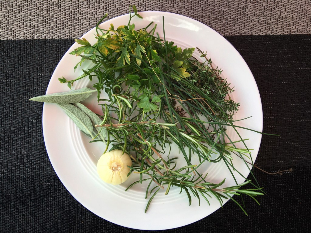 - Kräuter nach Wahl – hier: Rosmarin, Thymian, Salbei und Petersilie