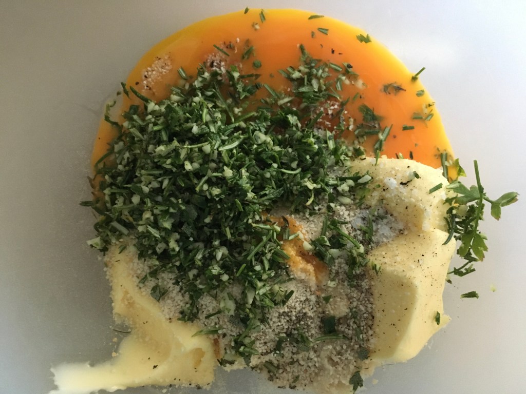 Die Butter mit den Semmelbröseln und dem Eigelb vermischen und die Kräuter hinzugeben. Mit Salz, Pfeffer und einem Spritzer Zitronensaft abschmecken.