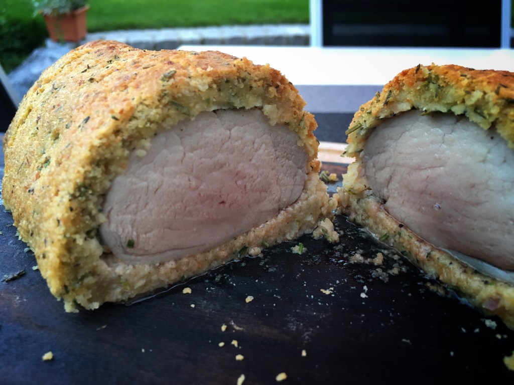Hier einmal der Anschnitt. Das Filet war sehr saftig. Zusammen mit dem leckeren Kräutermantel schmeckte das Fleisch wirklich hervorragend und machte eine zusätzliche Sauce überflüssig.