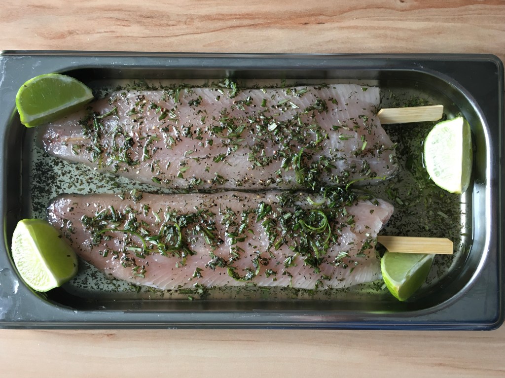 Eine Marinade für Fisch sollte möglichst wenig Säure enthalten, sonst wird das zarte Fleisch zu mürbe und zerfällt leicht auf dem Grill. Auch Salz sollte in der Marinade nur sparsam vorkommen. Es entzieht dem Fischfleisch nicht nur Wasser, sondern auch Aromen. Als Geschmacksgeber eignen sich grob zerstoßene Gewürze und kräftige Kräuter wie Rosmarin oder Thymian. Deshalb habe ich dieses mal, aus den oben aufgeführten Zutaten eine sanfte Kräutermarinade angerührt und die gewaschenen und von Schleim und Restgräten befreiten Filets darin 3 Stunden mariniert. Nach 1 1/2 Stunden wurden sie einmal gewendet.