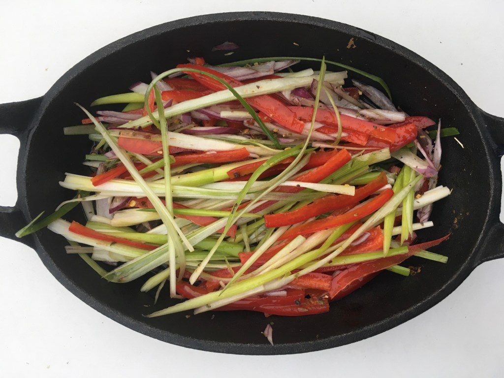 Für das Gemüsestroh habe ich Frühlingszwiebeln und eine Paprikaschote in ganz feine Streifen geschnitten und diese in einer kleinen Gusspfanne mit etwas Öl im indirekten Bereich im Grill gegart.