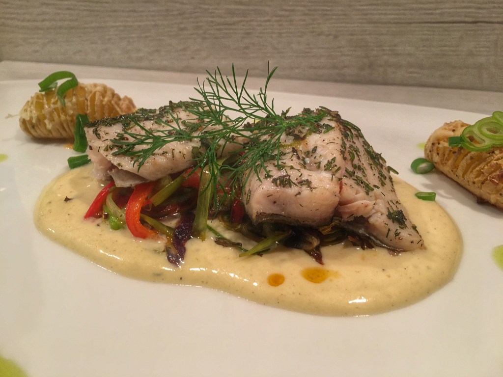Die Filets wurden mit einer Kräuter-Öl Marinade mariniert und als Beilage gab es Hasselback-Kartoffeln und Gemüsestroh. Ein Honig Senf Espuma aus dem Siphon und etwas Dillöl rundeten das Ganze ab und hoben dieses Gericht nochmal auf ein anders Level. Hier das Rezept dazu..