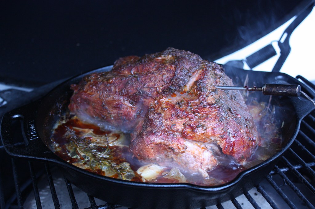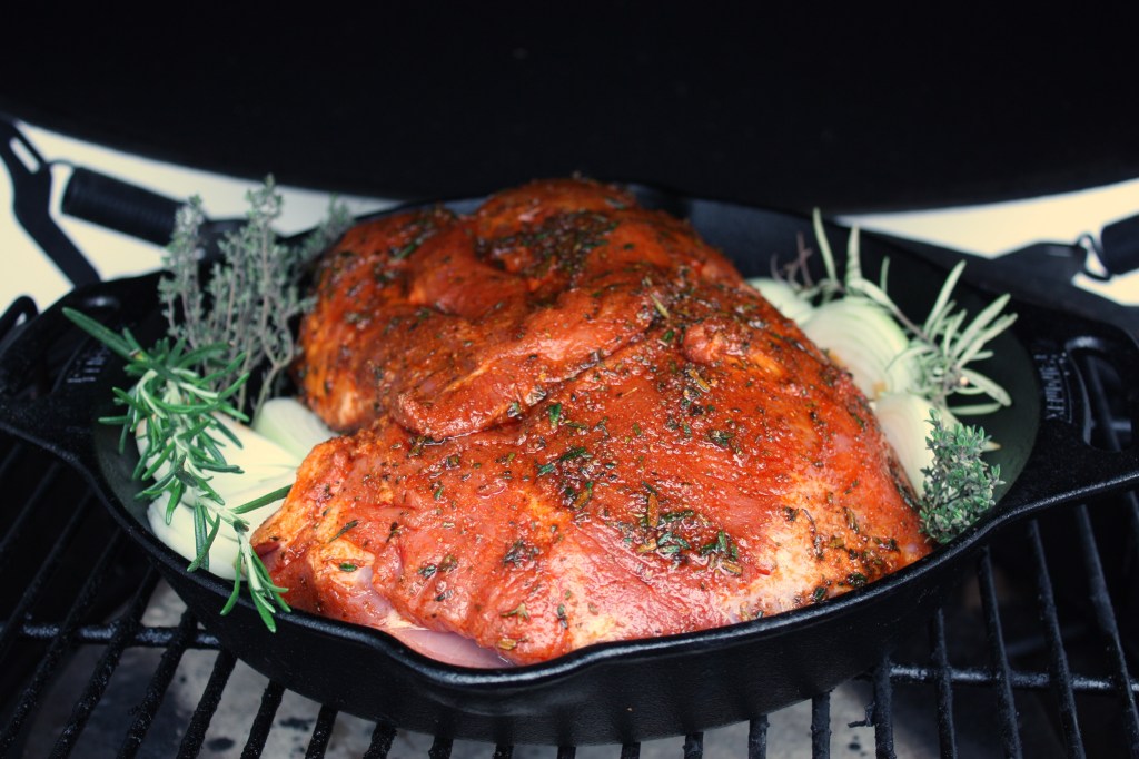 Gestern habe ich mal einen leckeren Schweinenackenbraten in einer Gusspfanne auf dem Big Green Egg zubereitet. Dieser war so lecker, dass ich euch hier das Rezept mal aufgeschrieben habe. Wenn ihr nicht alle Zutaten genau wie in der Liste zur Verfügung habt, macht nichts, experimentiert ruhig etwas. Wenn ihr euch an die grundlegenden Schritte haltet, werdet ihr einen supersaftigen und schmackhaften Braten genießen können. Schmeckt nicht, gibt‘s in diesem Fall nicht. Einfach und echt lecker! Als Beilage habe ich ein paar kleine Kartoffeln und gebratenen Spargel mit einer Sauce Hollandaise serviert.