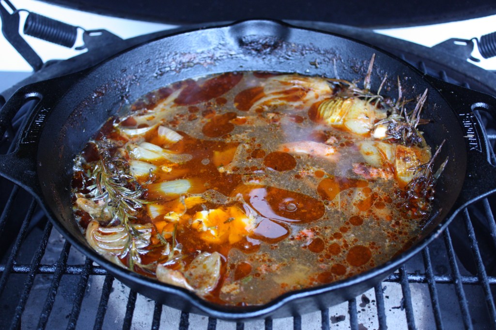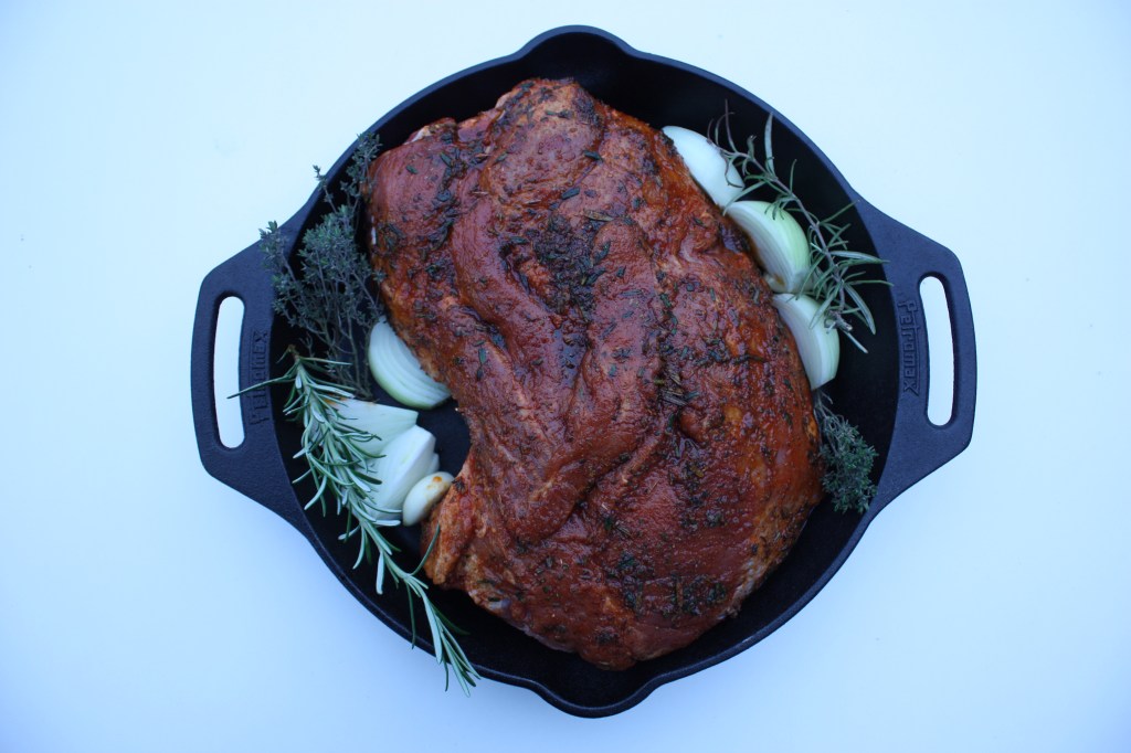 Anschließend darf das gute Stück Fleisch, zusammen mit einer geschälten und geviertelten Zwiebel sowie 2 Rosmarin- und Thymianzweigen, in der Gusspfanne Platz nehmen.