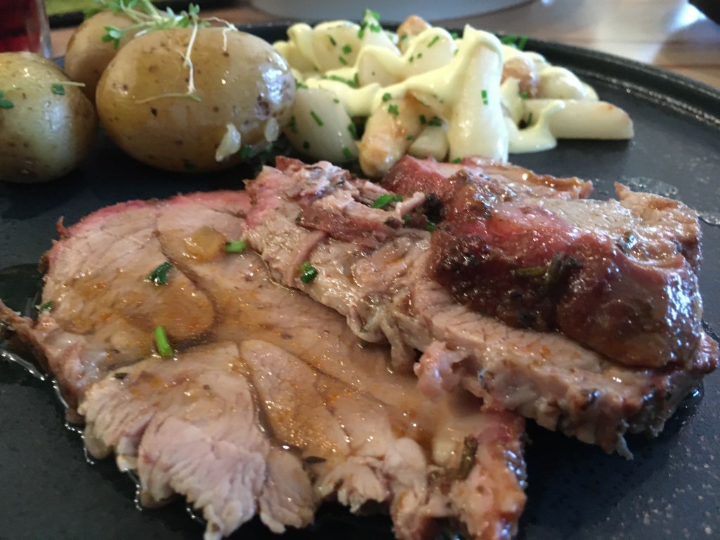Zwischendurch immer mal nachschauen, ob noch genügend Flüssigkeit in der Pfanne ist, ansonsten noch etwas Bier nachgeben. Der Braten ist fertig, wenn er eine Kerntemperatur von 75 Grad erreicht hat. Das dauert ca. 2 Stunden.