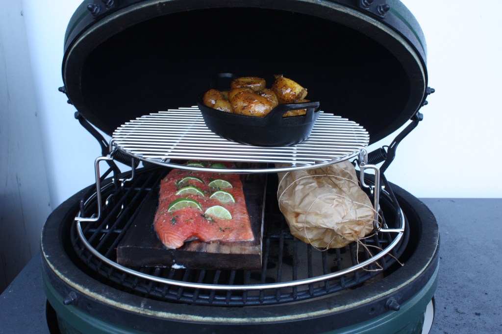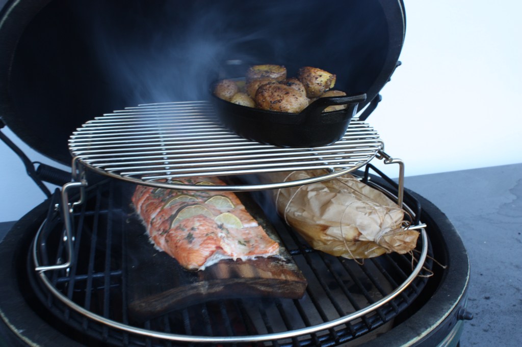 Der Saibling wurde im direkten Bereich bei ca.180 Grad bis zu einer Kerntemperatur von 55 Grad gegrillt. Heute kam zum ersten mal die neue Eggspander-Erweiterung zum Einsatz. Diese ermöglicht es mir, im Egg auf einer weiteren Ebene zu grillen.