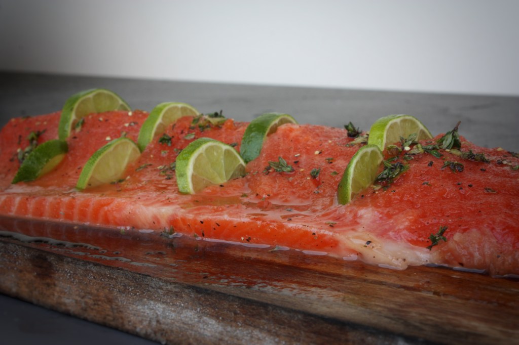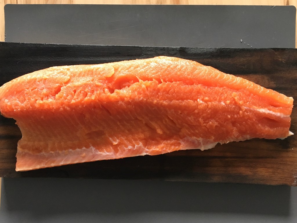 Nach dem Auftauen habe ich das Filet erstmal mit einer Pinzette grätenfrei gezupft, entschleimt und gewaschen. Das ging ziemlich einfach und war schnell erledigt. Anschließend wurde das Filet abgetrocknet und auf der Planke platziert.