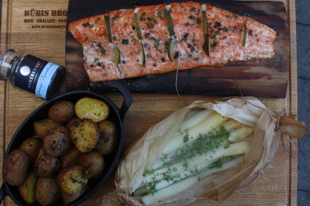 Hier gibt es also heute das erste Rezept dazu. Ich habe mich als erste Variante für eine Zubereitung auf einer Buchenplanke entschieden. Dazu gab es Spargel aus dem Backpapier vom Grill mit einer Sauce Hollandaise und ein paar Trüffelkartoffeln. Das ganze Gericht habe ich in meinem Big Green Egg zubereitet.