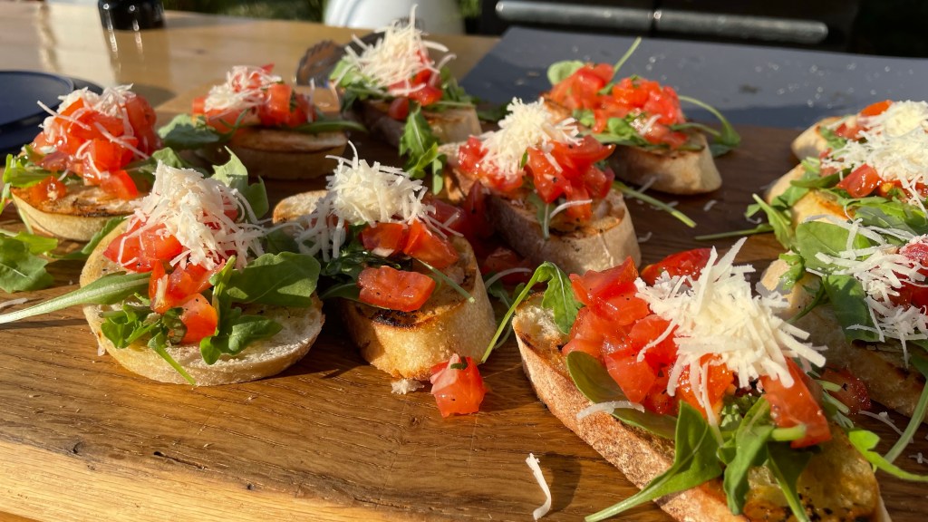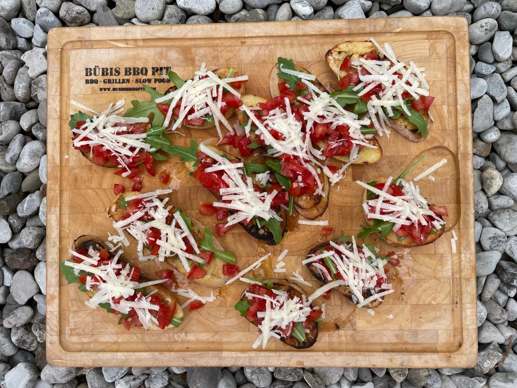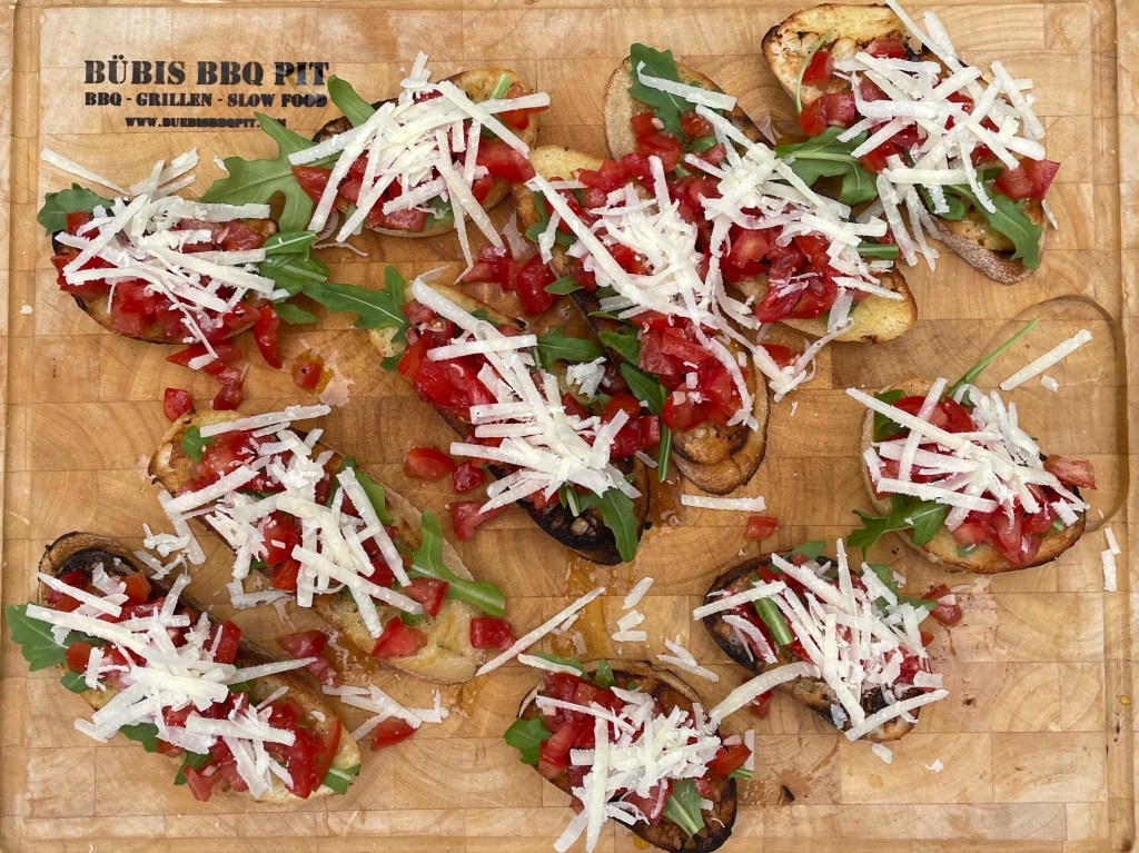 Knuspriges Ciabattabrot mit Tomaten, Knoblauch, Olivenöl, Parmesan und etwas Rucola. Wer kann da schon ‚Nein’ sagen? Ein leckerer Snack vom Grill, der sich superleicht zuzubereiten lässt, gut vorzubereiten ist und richtig lecker schmeckt. Optimal auch als Vorspeise bei eurem nächsten BBQ Abend. Also, ab an den Grill, holt euch den Geschmack Italiens in den Garten.