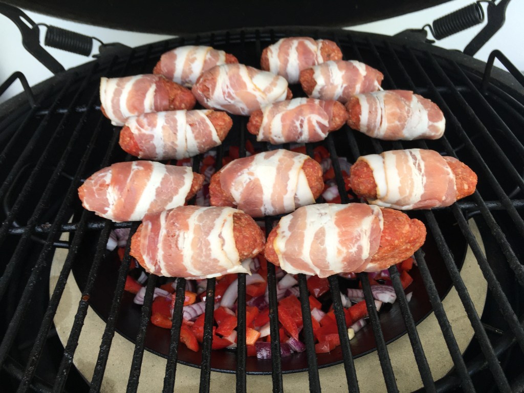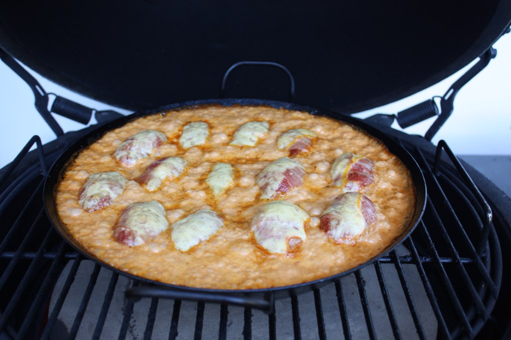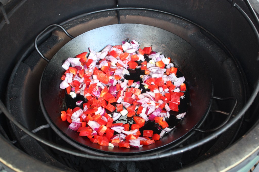 Das Egg anheizen und das Gemüse in etwas Öl kurz über direkter Hitze anschwitzen. Das Egg nun auf indirekte Hitze umrüsten, ein kleines Stück Smokeholz auf die Glut legen. Die Pfanne direkt auf den Convector stellen, den Rost auflegen und die Fleischstücke über der Pfanne eine halbe Stunde bei 120 Grad smoken. Das Fett vom Bacon kann so in die Pfanne tropfen und gibt der Sauce zusätzlich Geschmack.