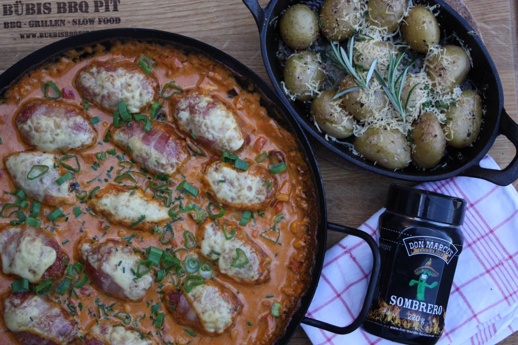 Jetzt das Gemüse in Tomatenmark einrühren, kurz anrösten und mit der Sahne aufgießen. Nun den Rub einrühren und die „Sombrero Granaten“ in die Sauce setzen. Jedes Fleischstück mit einem Streifen Käse belegen und das Gericht weitere 30 Minuten garen und die Sauce gleichzeitig etwas einkochen.