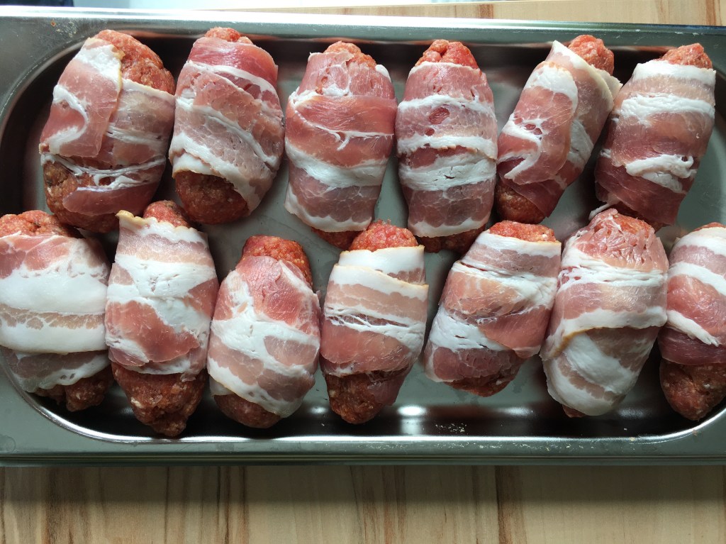 Jedes Stück Hackfleisch mit einer Scheibe Bacon umwickeln. Das Gemüse für die Sauce fein Würfeln.