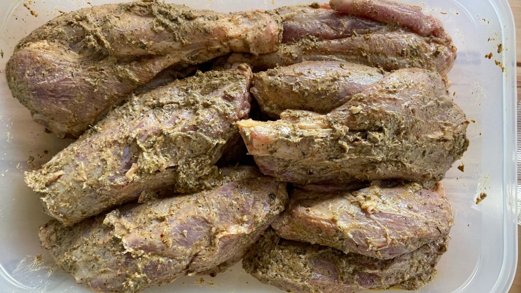 Die Zubereitung ist genauso einfach wie genial. Einfach 3 Esslöffel Joguhrt und 2 Esslöffel Rub miteinander vermengen und über die geputzten Haxen geben. Im idealen Fall 24 Stunden marinieren lassen.