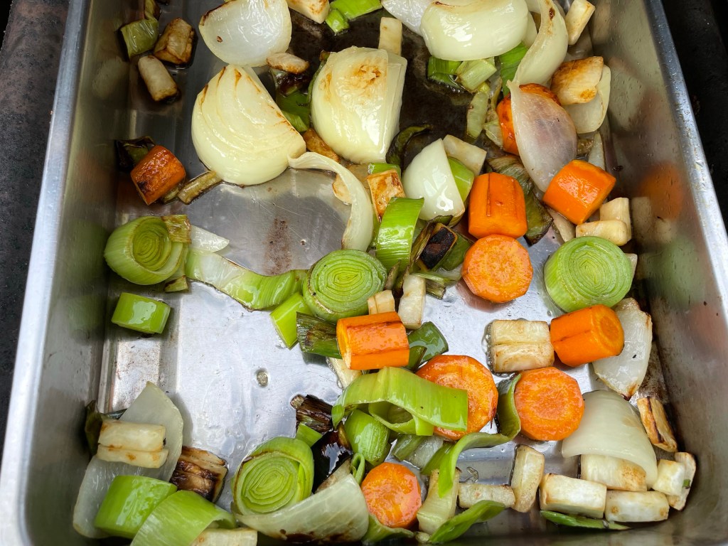 Unter der Haxe platziert ihr eine Schale mit dem geputzten und klein geschnittenen Suppengrün. Dieses röstet ihr kurz in etwas Öl an, indem ihr den Brenner unter der Schale zündet.