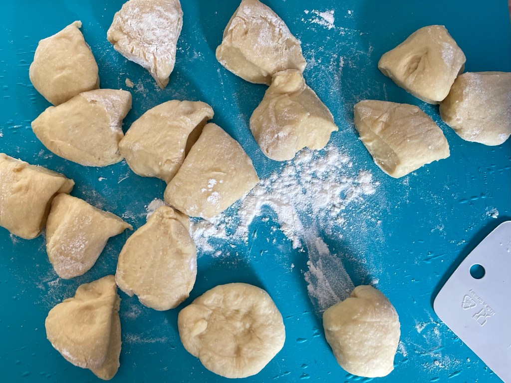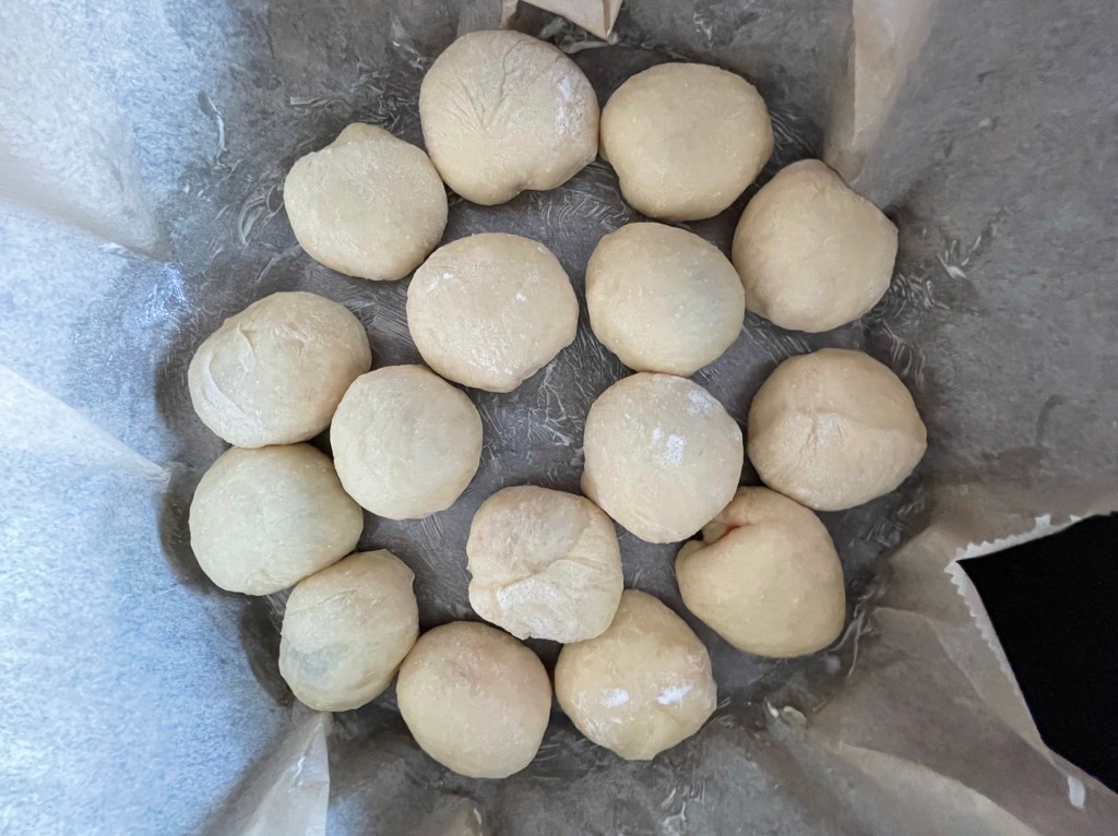 Für 90 Minuten abgedeckt an einem warmen Ort gehen lassen. Den Teig anschließend noch einmal mit der Hand kneten, kleine Portionen abstechen und zu Kugeln formen.