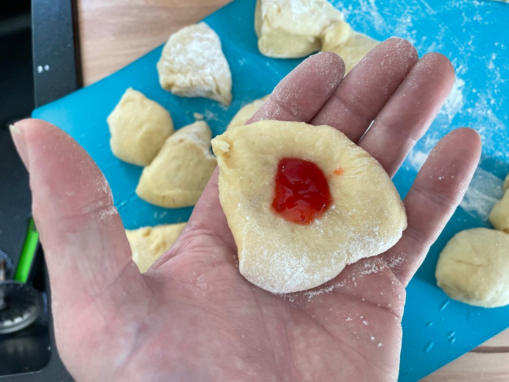 Klecks Marmelade in die Mitte geben. Die Ränder hochziehen und über der Füllung zusammendrücken, um die Buchteln zu verschließen.