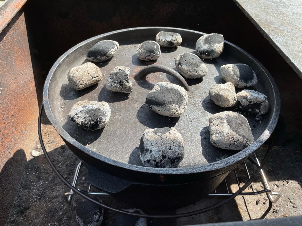 In der Zwischenzeit können die Briketts vorbereitet werden. Unter dem Dutch Oven 4 und auf dem Deckel 14 Briketts gleichmäßig verteilen.