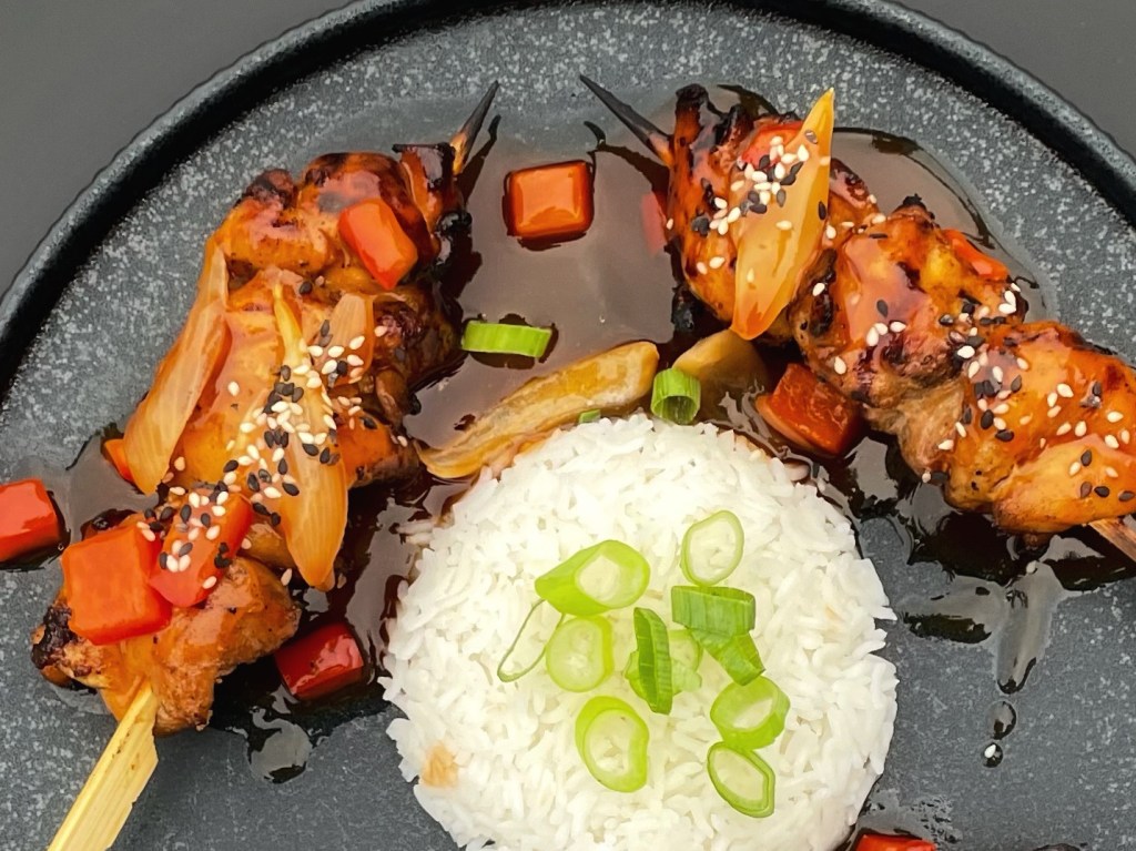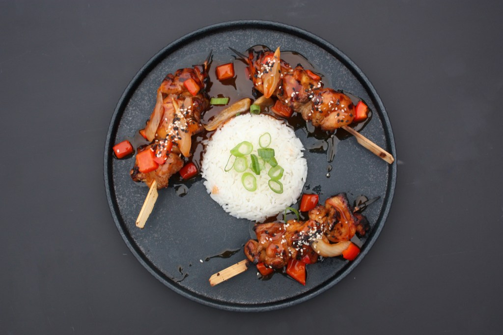Jetzt kann angerichtet werden. Den heißen Reis in eine kleine Schale geben etwas andrücken und auf die Tellermitte stürzen. Die Spieße auf den Teller geben und etwas von der leckeren Sauce darüber geben. Ein paar Frühlingszwiebeln und etwas Sesam geben den letzten Touch…