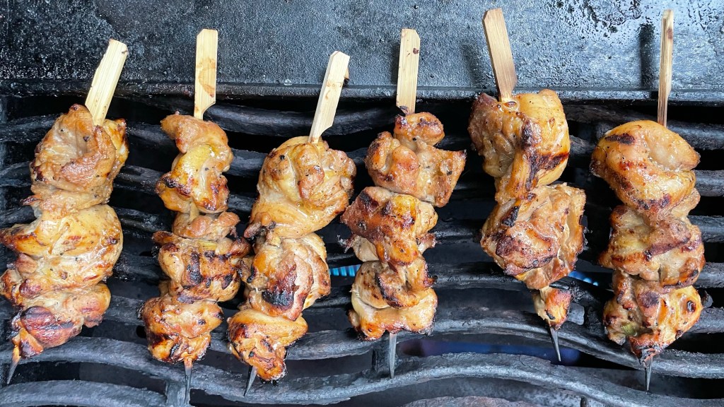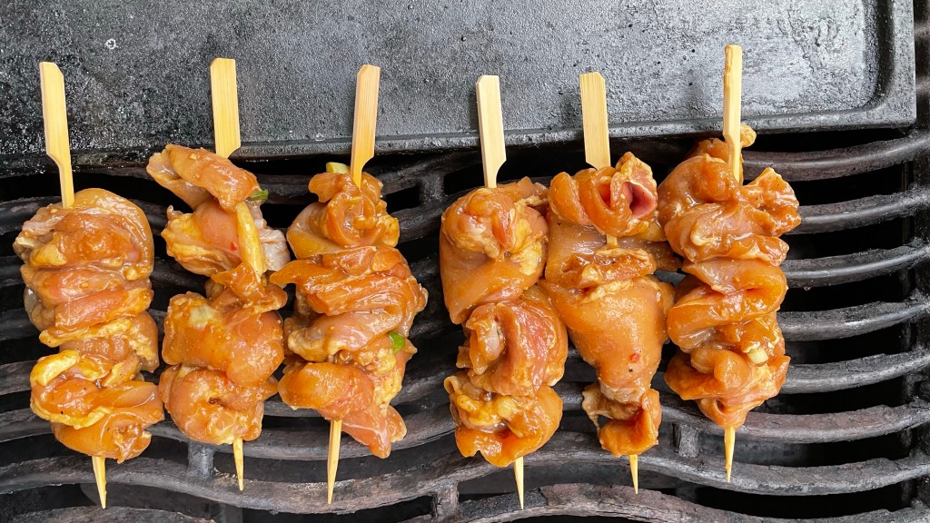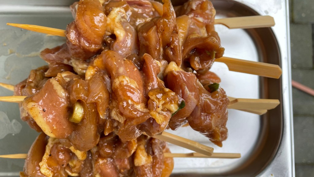 Während die Sauce vor sich hin köchelt, wird der Grill schon einmal vorgeheizt und die Spieße werden vorbereitet. Dazu wird das Hähnchenfleisch aus der Marinade genommen und wellenförmig auf die zuvor gewässerten Bambusspieße gesteckt.