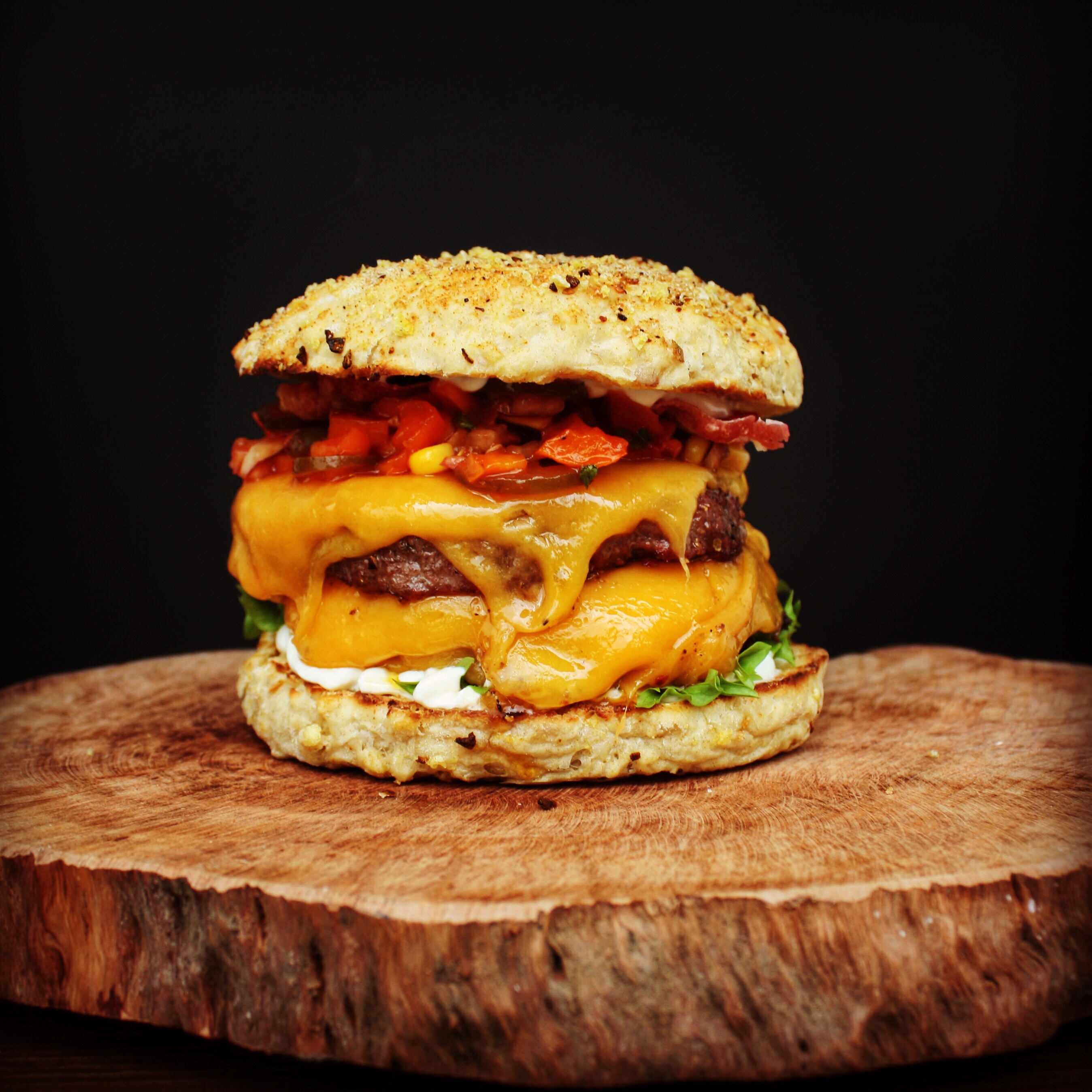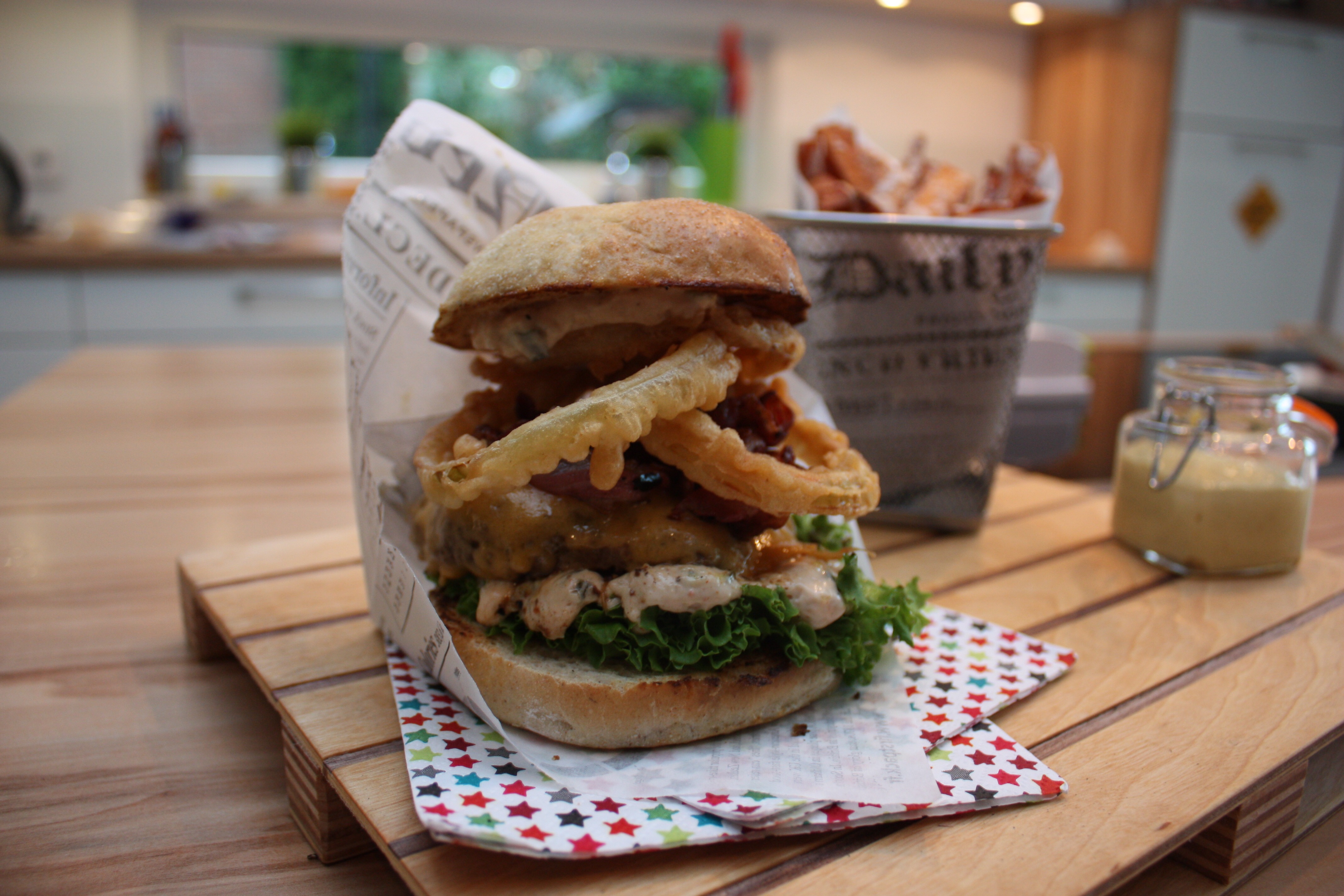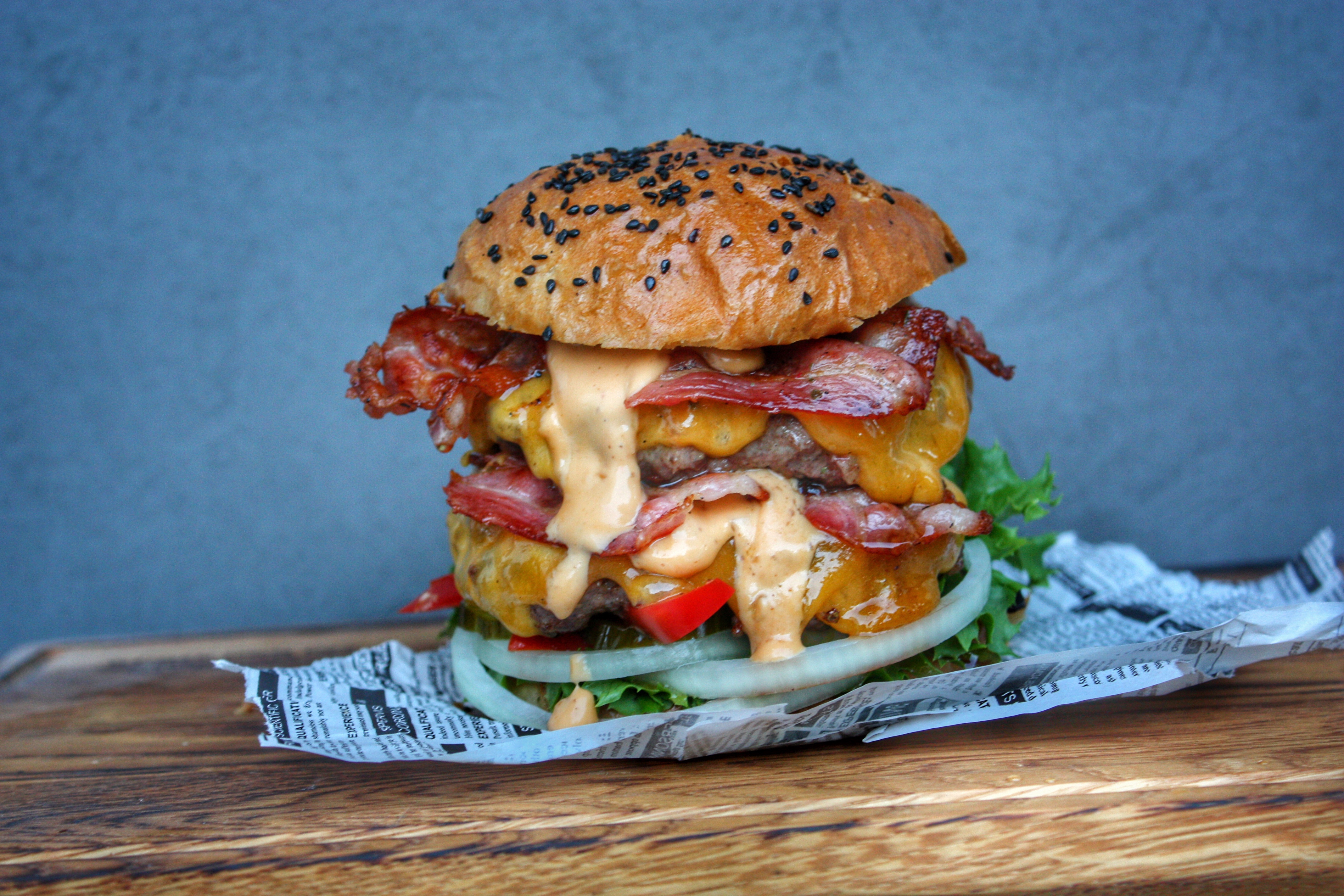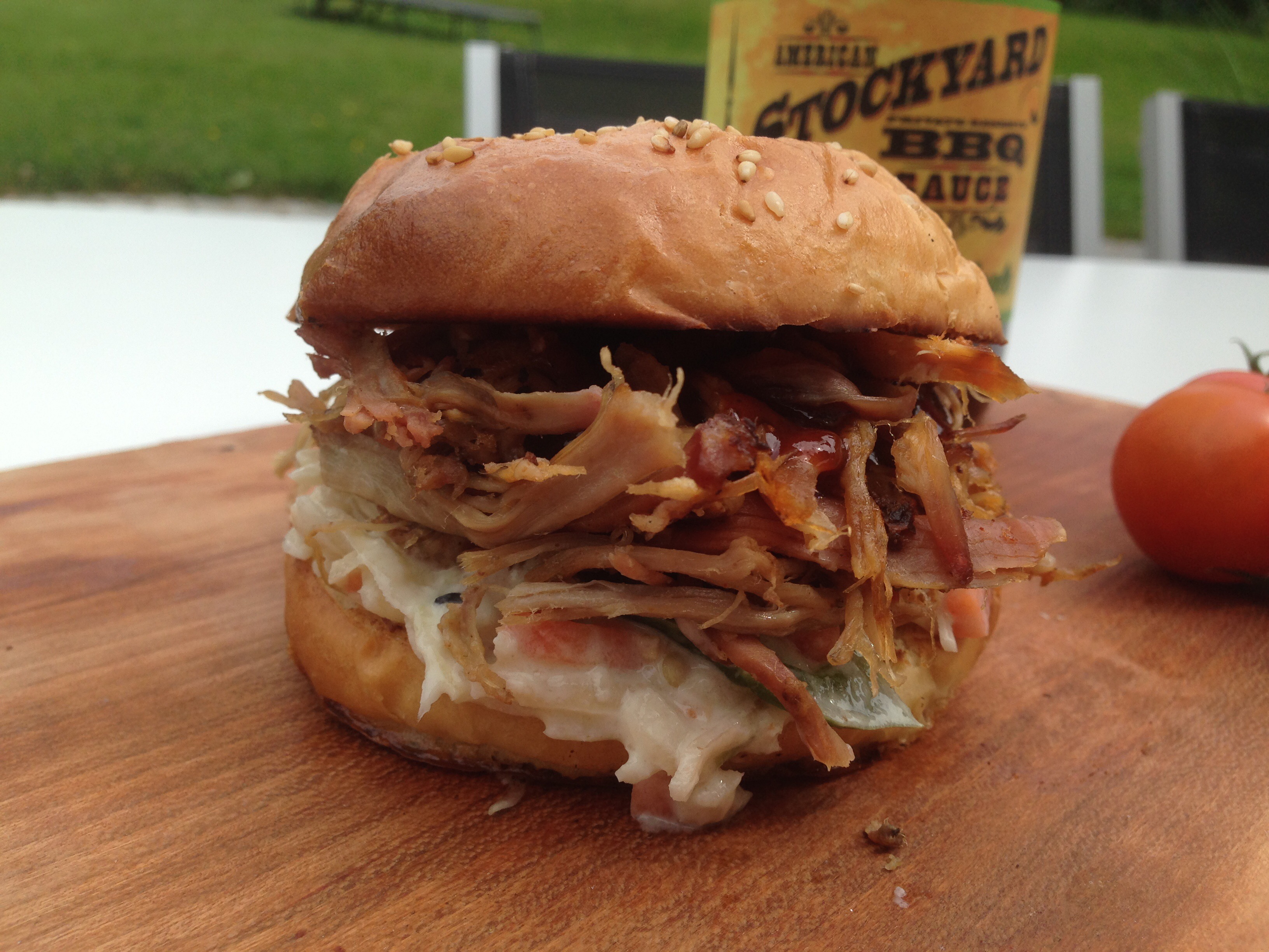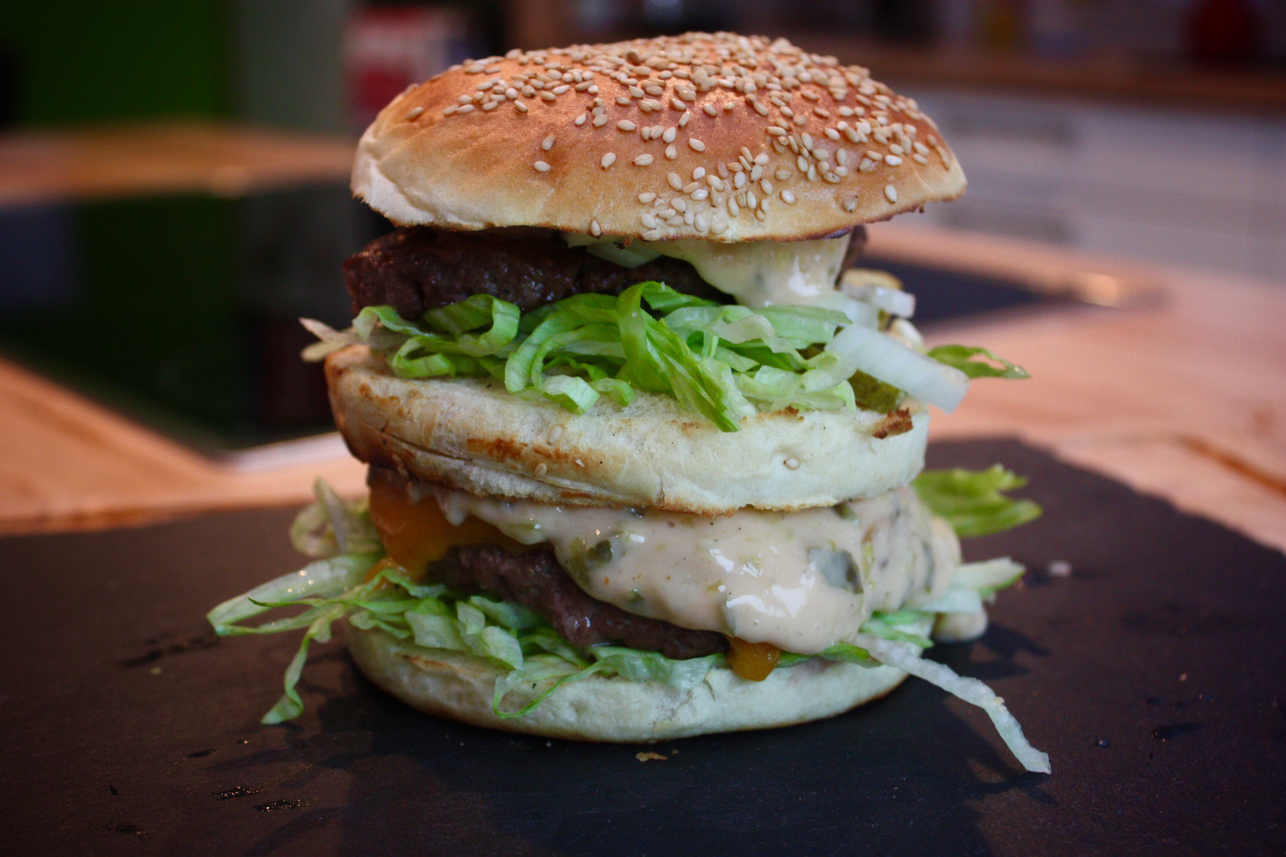 Heute gibt es mal kein kompletes Rezept sondern einfach etwas Inspiration. Ehrlich gesagt fand ich die Bilder des heute gegrillten Burgers einfach zu schön, um sie in den Tiefen des Flashspeichers verschwinden zu lassen. Ganz nebenbei hat er auch überragend geschmeckt. Zwei saftige, medium gegrillte DryAged Rindfleisch Patties und ein selbst gebackener saftiger Bun vereinten sich mit Lollo Biondo Salat, selbst gepickelten Gurken und Paprika, frischen Zwiebeln und geschmolzenem Cheddarkäse. Knuspriger Bacon und die geniale „Bigger than Mac Sauce“ von „Saus Guru“ setzten dem Ganzen die Krone auf.