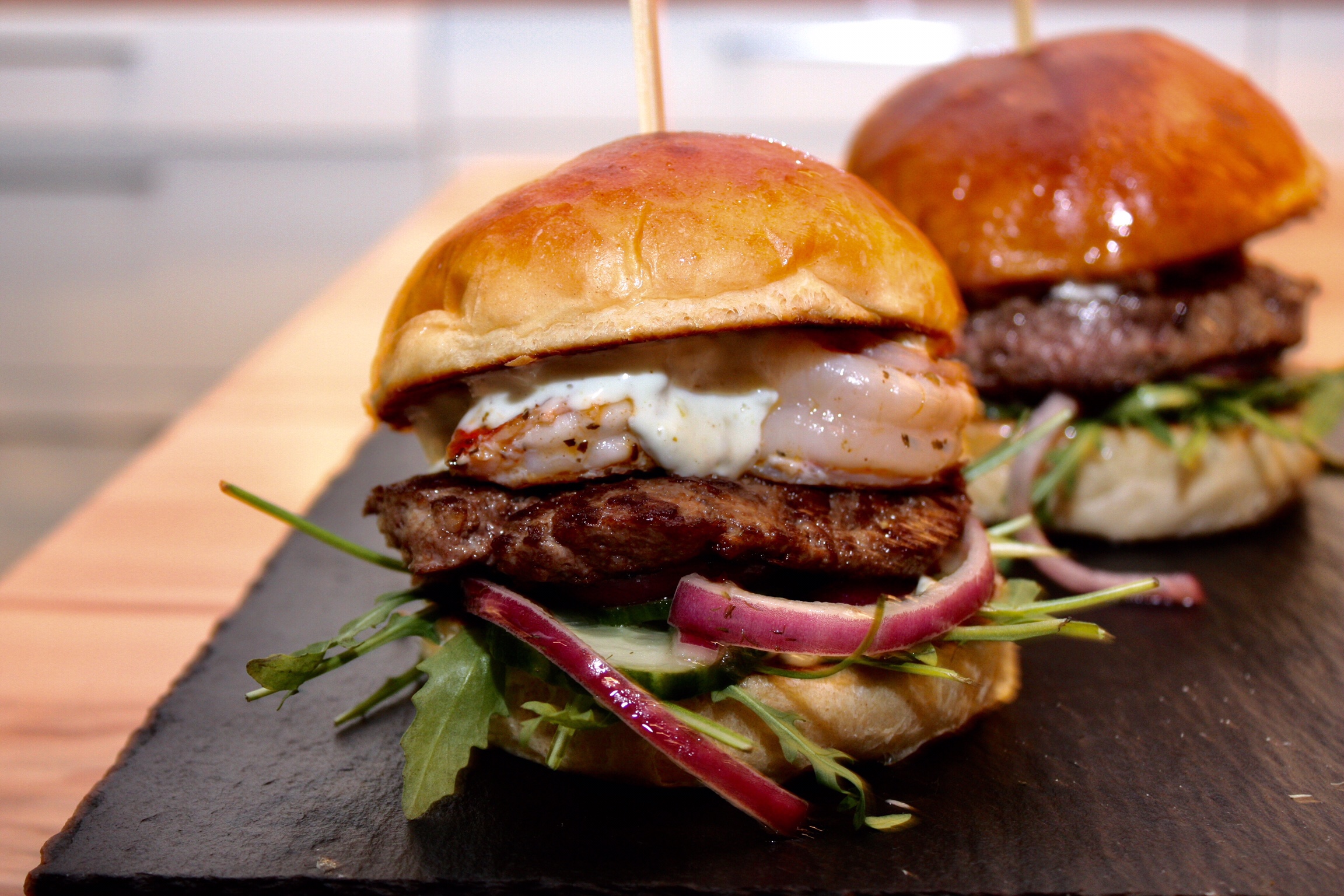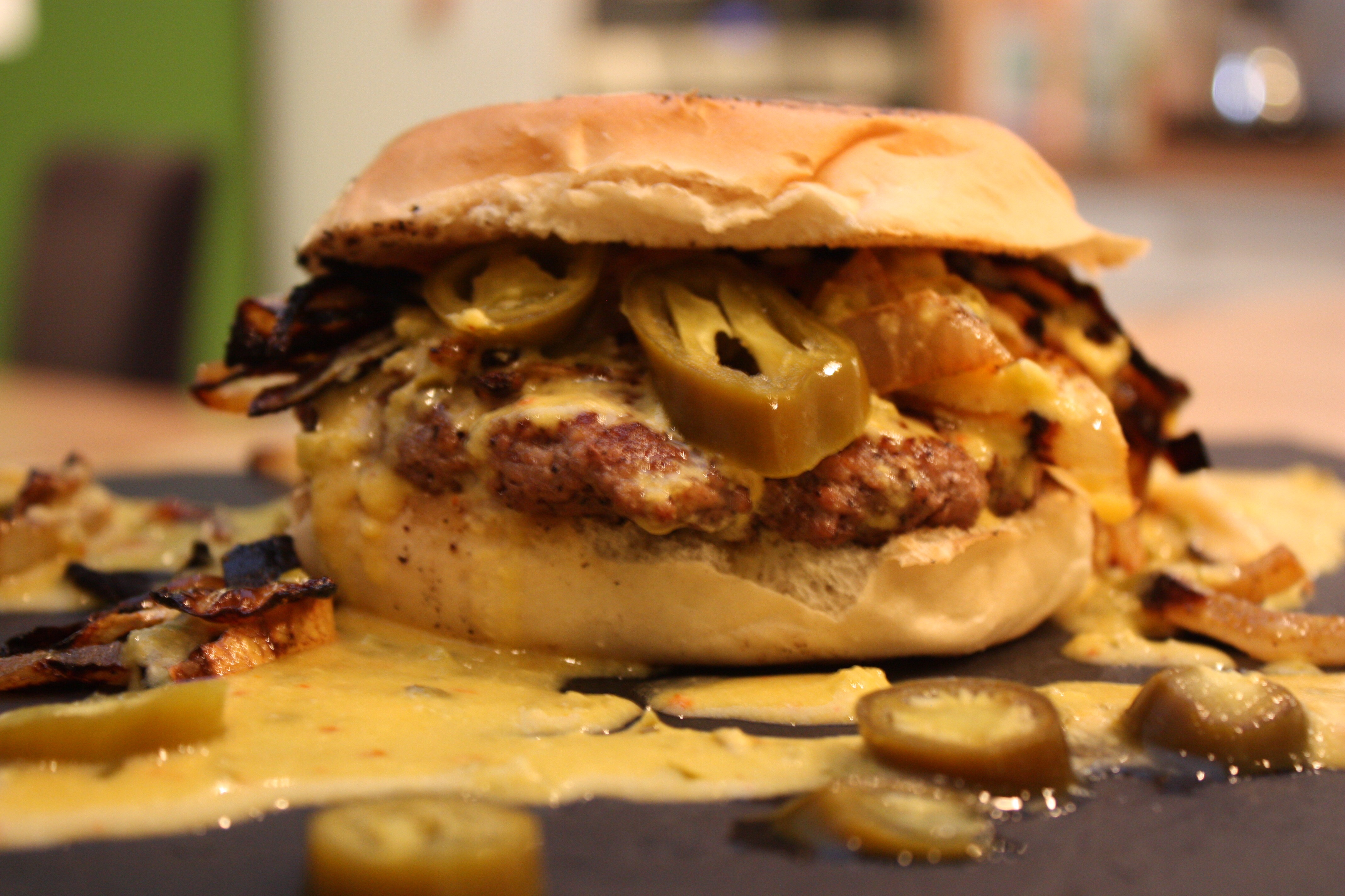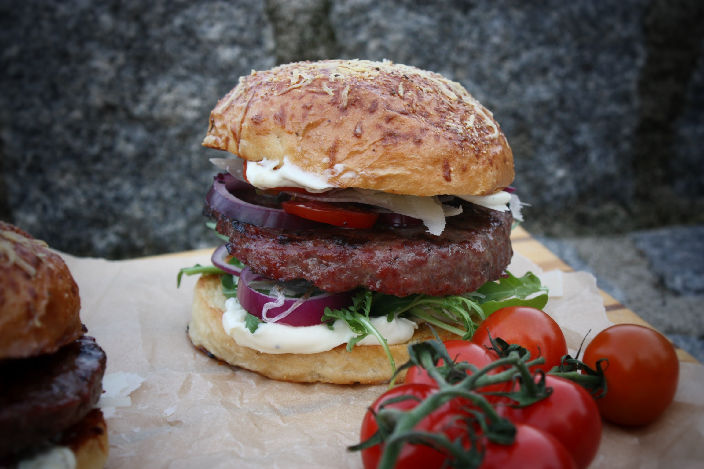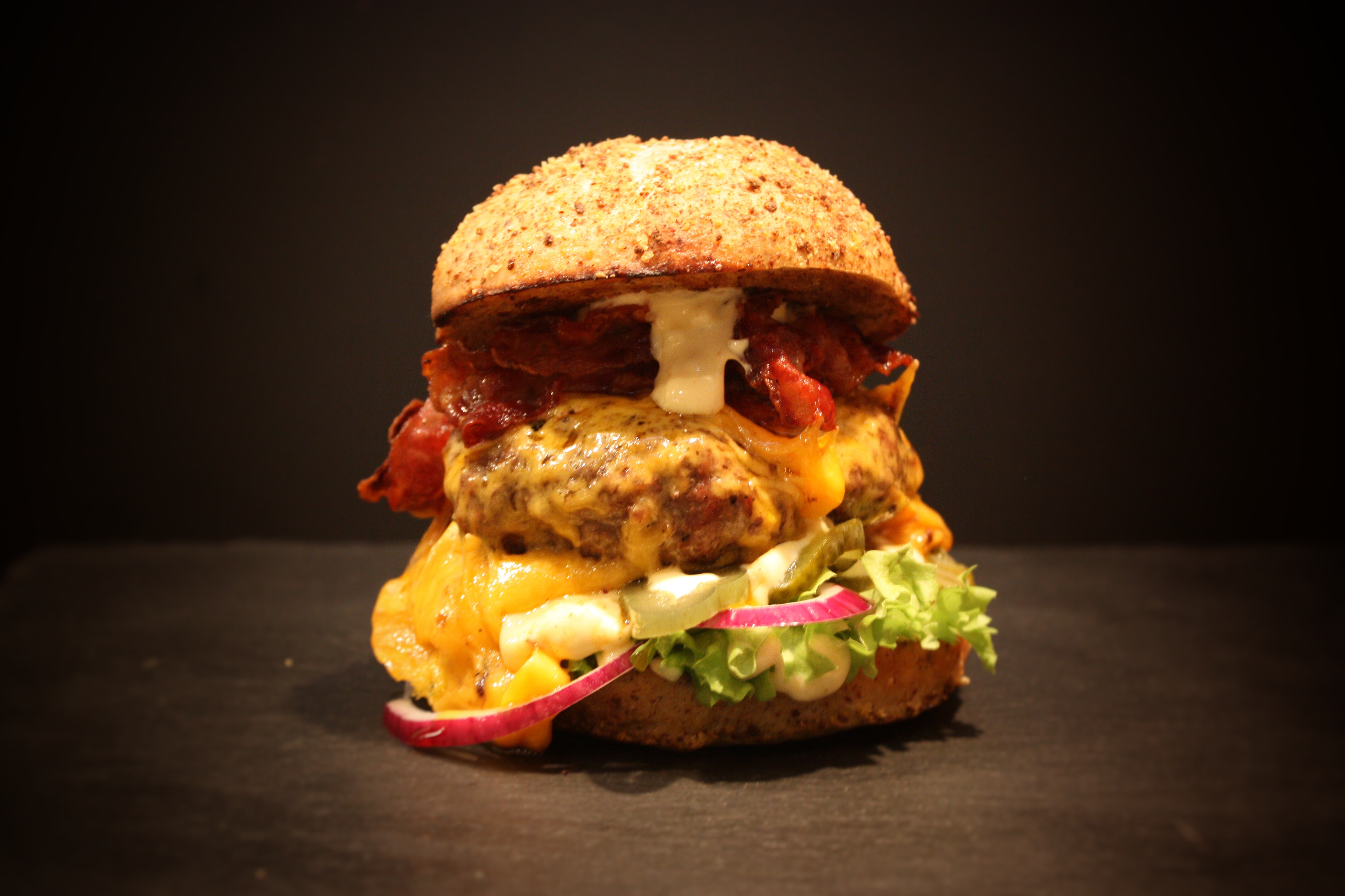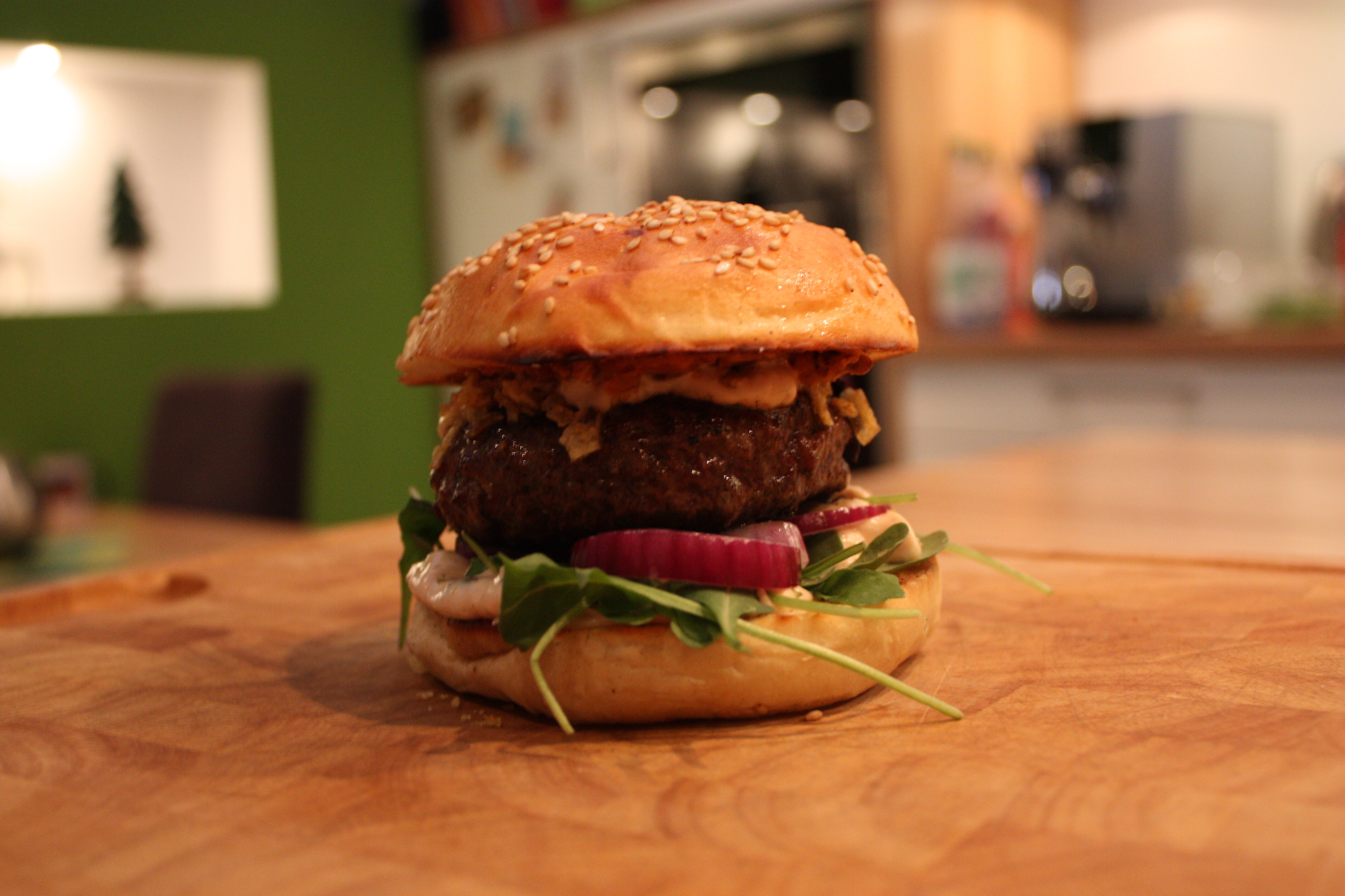 Da ist als erstes ein saftiges Paddy. Gutes Rindfleisch, im optimalen Fall frisch gewolft, mit einem Fettanteil von 25% sind genial. Als zweites, aber nicht minder wichtig, ein selbstgebackener fluffiger Bun. Er sollte weich sein, aber fest genug um Saucen und Fleischsäfte aufzunehmen, ohne auseinanderzufallen. Als drittes eine gute Burgersauce. Sie sollte cremig, süßlich, mit einer milden Säure und ganz nach Geschmack, eventuell mit einer gewissen Schärfe daherkommen. Geschmacklich auf die weiteren Zutaten abgestimmt kann sie zum geheimen Star des Burgers avancieren. Bei den weiteren Zutaten die auf den Burger kommen, sind dann Geschmack und Kreativität ausschlaggebend. Ob Bacon, Käse, Zwiebeln frisch, oder geschmort, Salat, Gurken Tomaten, oder gepickeltes Gemüse. Es gibt unzählige Möglichkeiten deinen Burger zu einem geschmacklichen Feuerwerk werden zu lassen.