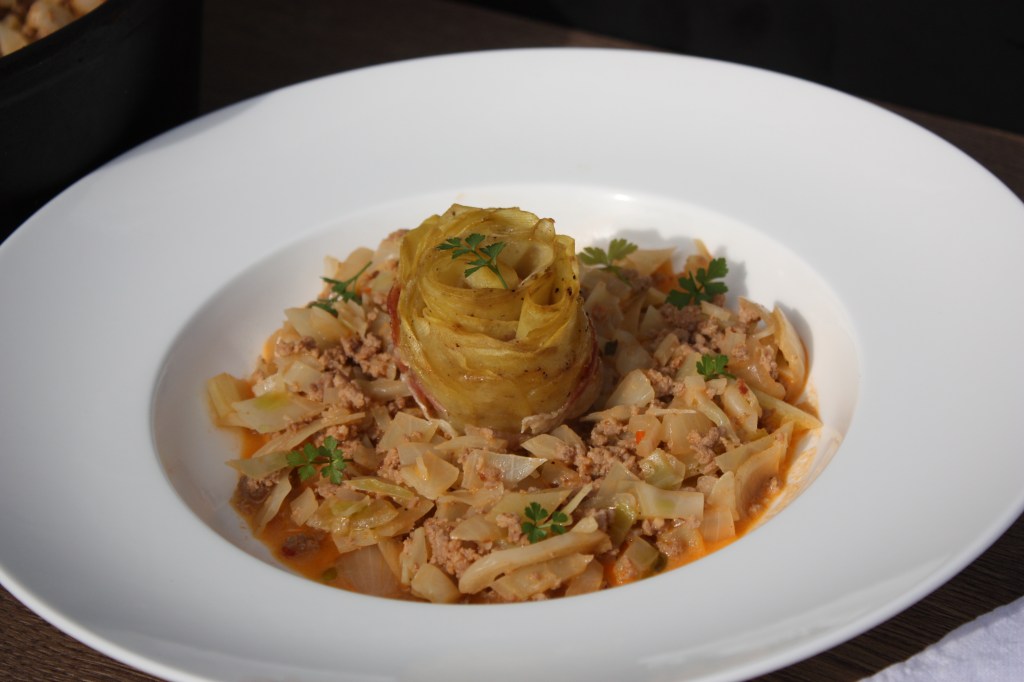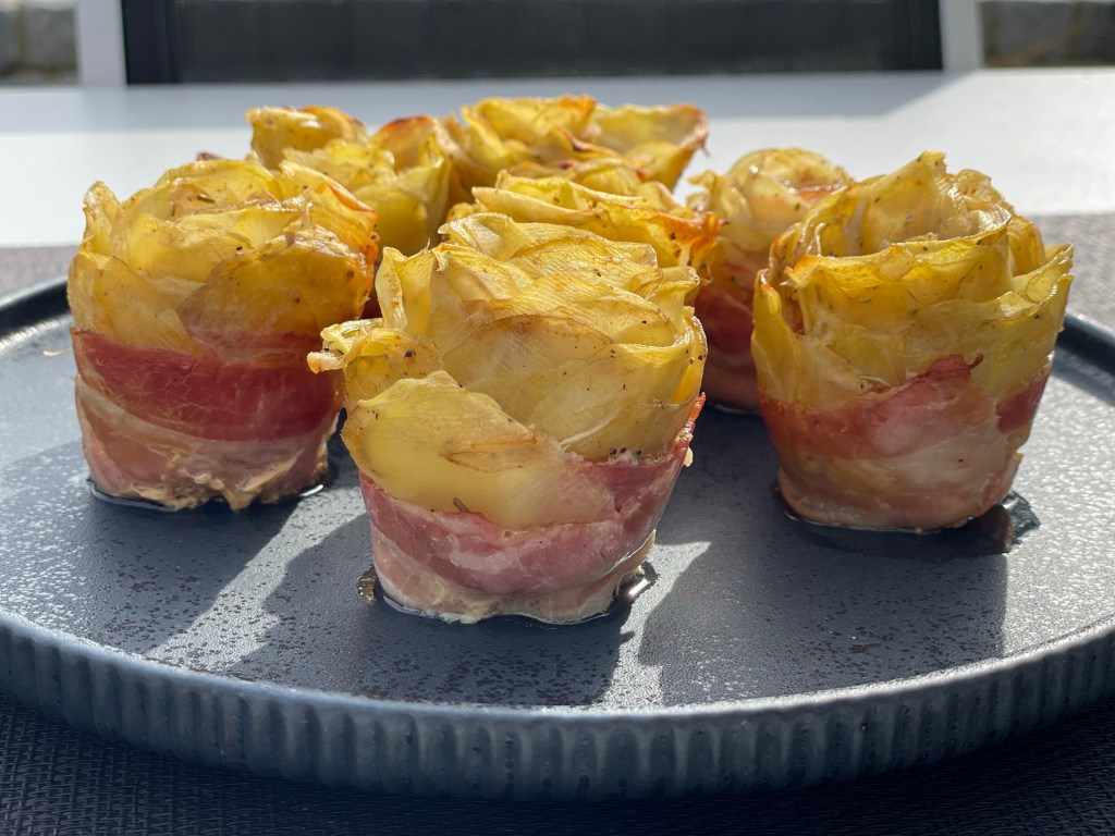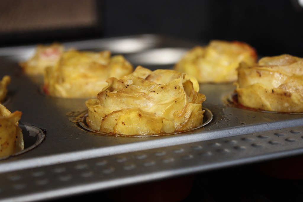 Die Kartoffel-Speck-Reihen als Rosen aufrollen und in eine gefettete Muffinform setzen.