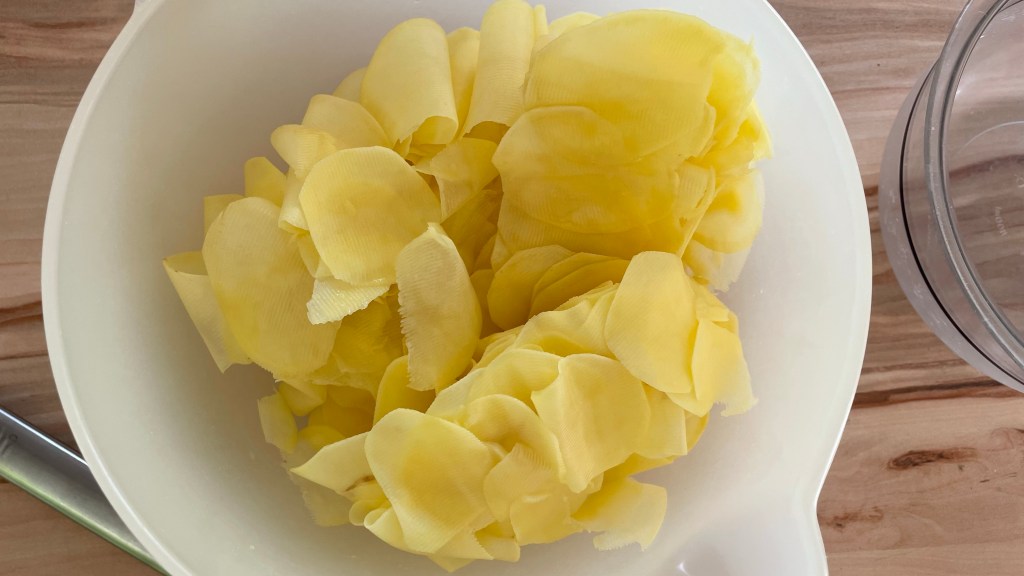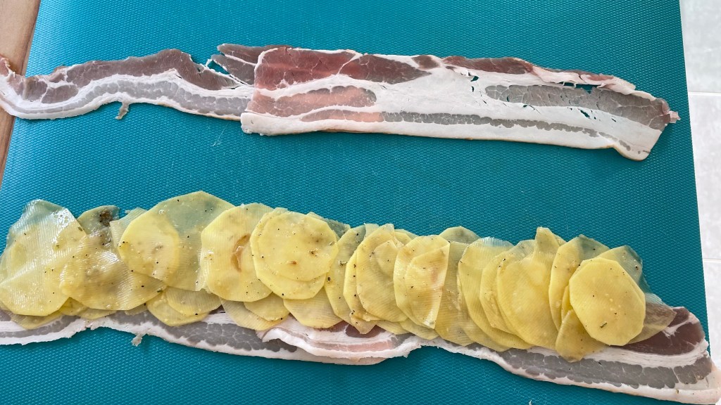 Kartoffelscheiben auf den Speck nebeneinander legen und ebenso darauf achten, dass sich die einzelnen Scheiben überlappen.