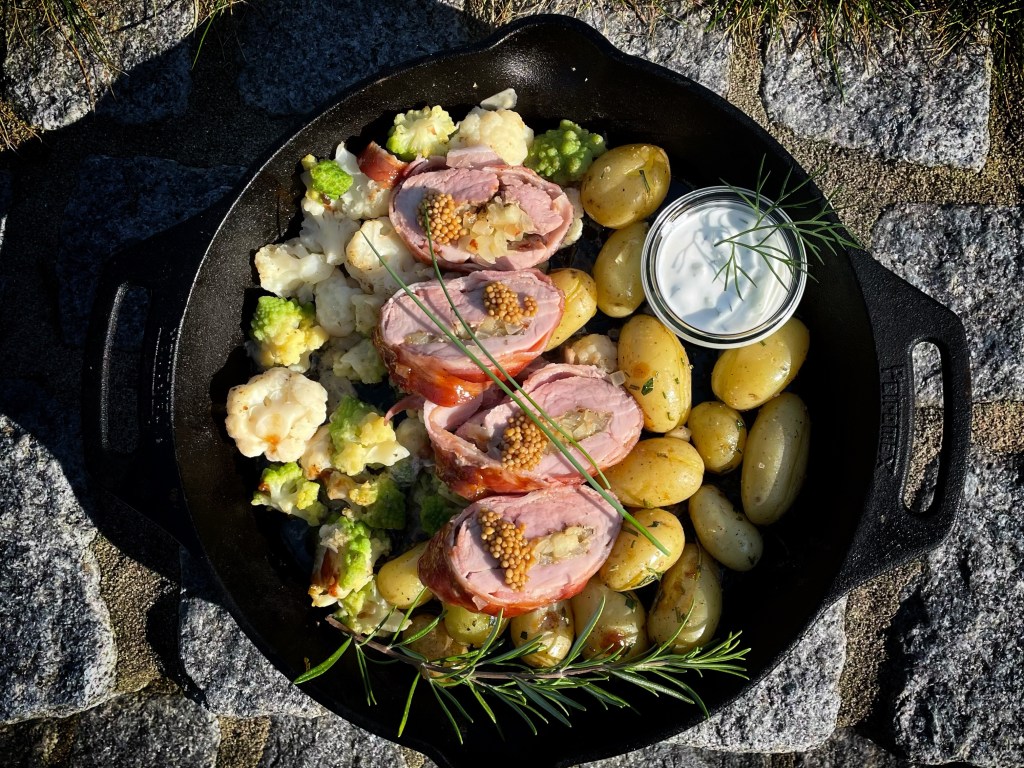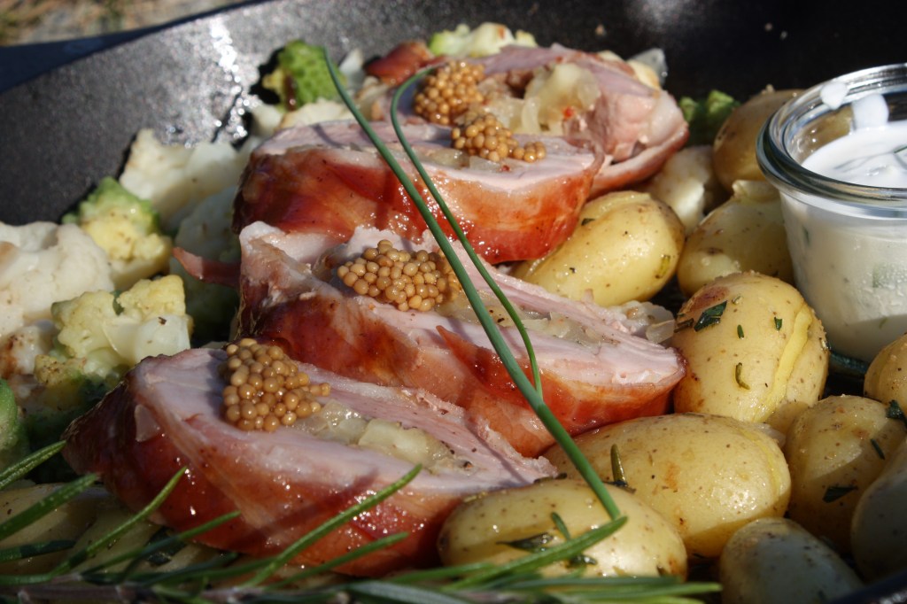 Und schon kann serviert werden. Angerichtet wurde das Ganze in einer Gusspfanne zusammen mit kleinen Kartoffeln und etwas Romanesco und Blumenkohl. Ein Kräuterquark und der selbstgemachte Senfkaviar runden das Gericht ab.