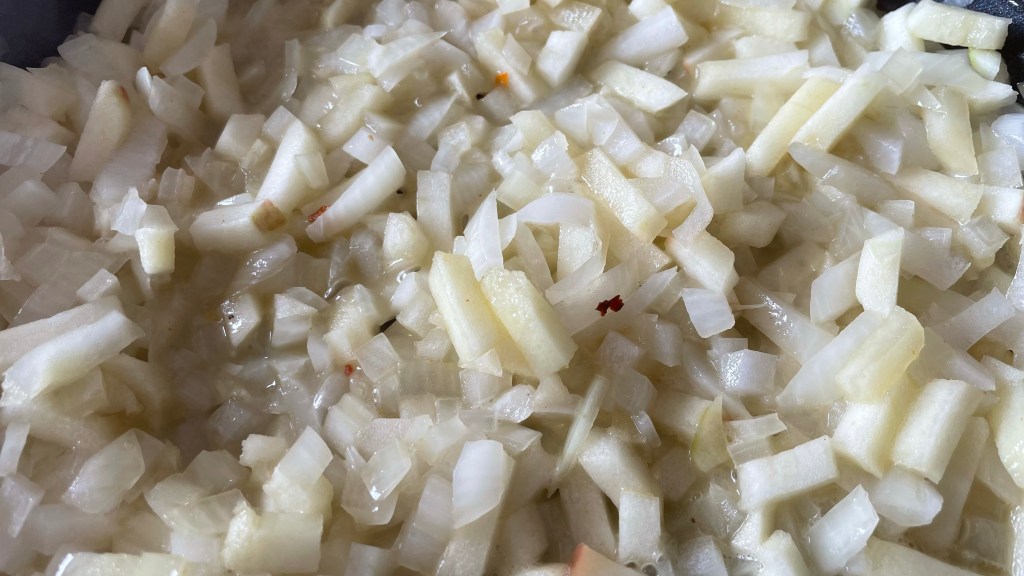 Den Apfel und die Zwiebel schälen und in feine Würfel schneiden. Damit der Apfel nicht braun wird, etwas Zitronensaft hinzugeben und gut durchmengen. Olivenöl in einer Pfanne erhitzen und die Apfel-Zwiebel-Mischung zusammen mit dem braunen Zucker in die Pfanne geben und bei geringer Hitze weich garen. Mit einer Prise Salz und etwas Currypulver und ein ganz paar Chiliflocken abschmecken und abkühlen lassen.