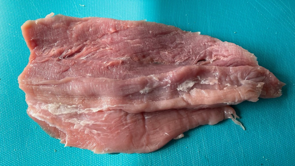 Das Filet vorsichtig im oberen Drittel einschneiden. Genauso im unteren Drittel einschneiden, nur von der anderen Seite. So könnt ihr das Filet leicht ausklappen und erhaltet eine größere Oberfläche. Bei Bedarf noch etwas plattieren. Die Innenseite salzen und pfeffern.