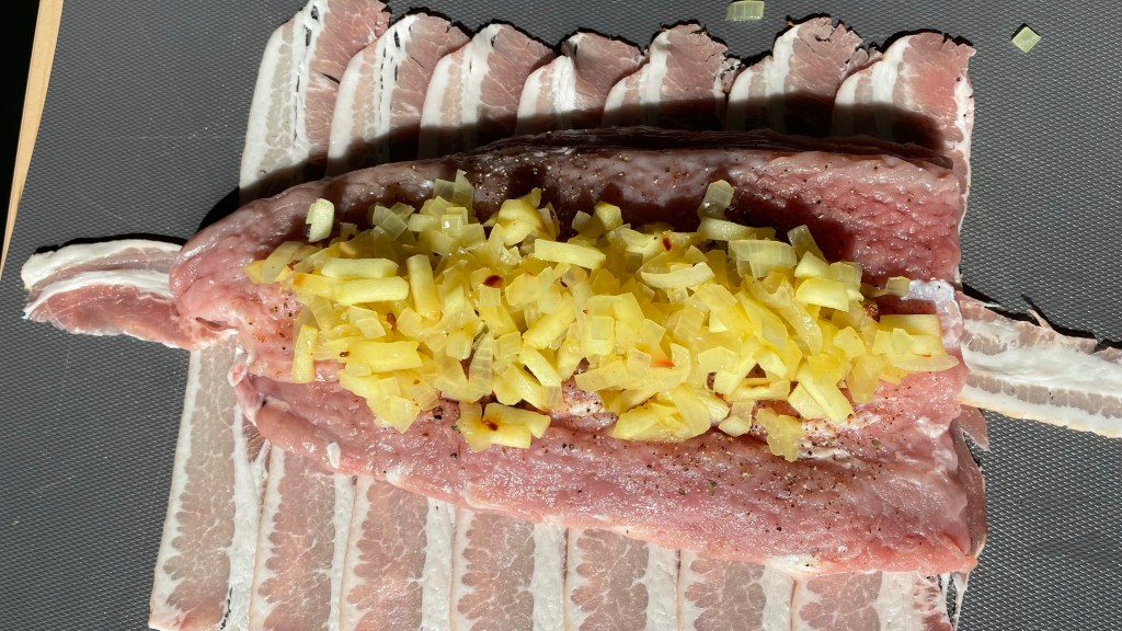 Heute hatte ich mal wieder Lust etwas herumzuexperimentieren. Die Idee war ein Schweinefilet mit einer Mischung aus pikant abgeschmeckten Zwiebel- und Apfelwürfeln zu füllen und anschließend in einem feinen Baconmantel auf dem Grill zu garen. Was soll ich sagen? Megalecker und zum Nachgrillen empfohlen.