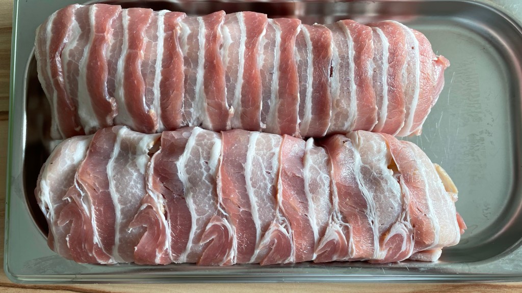 Den Bacon in Streifen auslegen und das Filet daraufsetzen. Die Masse darauf verteilen und das Filet zusammen mit dem Bacon einrollen. Tipp: eine flexible Schneidunterlage ist hierbei eine große Hilfe.
