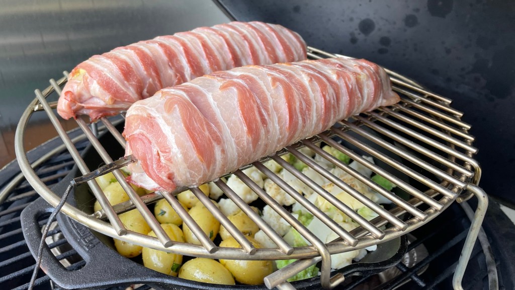 Tipp: Beilagen unter dem Rost garen und das köstliche Baconfett damit auffangen. Geschmacksbooster!!!