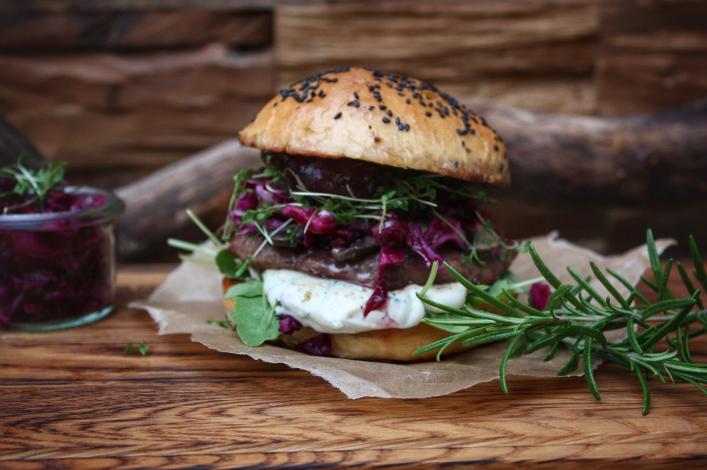 Saftige Burgerpatties aus Wildfleisch mit einem leckeren Topping aus eingelegtem Rotkohl, geschmorten Champignons und Preiselbeeren, dazu etwas Crème Fraîche mit frischer Kresse – dieser Burger ist im Winter für alle Wildfans ein Highlight.