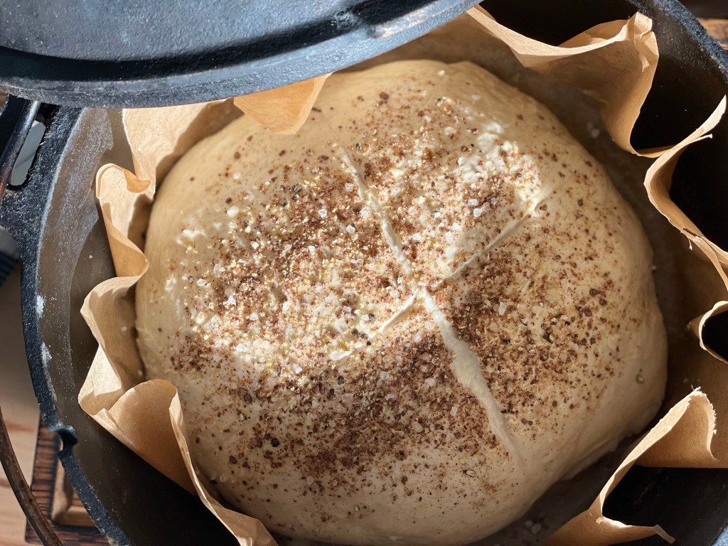 Den Brotleib im Dutchoven mit der Wasser-Ei Mischung einpinseln, mit dem Topping bestreuen und mit einem Messer über Kreuz einschneiden.