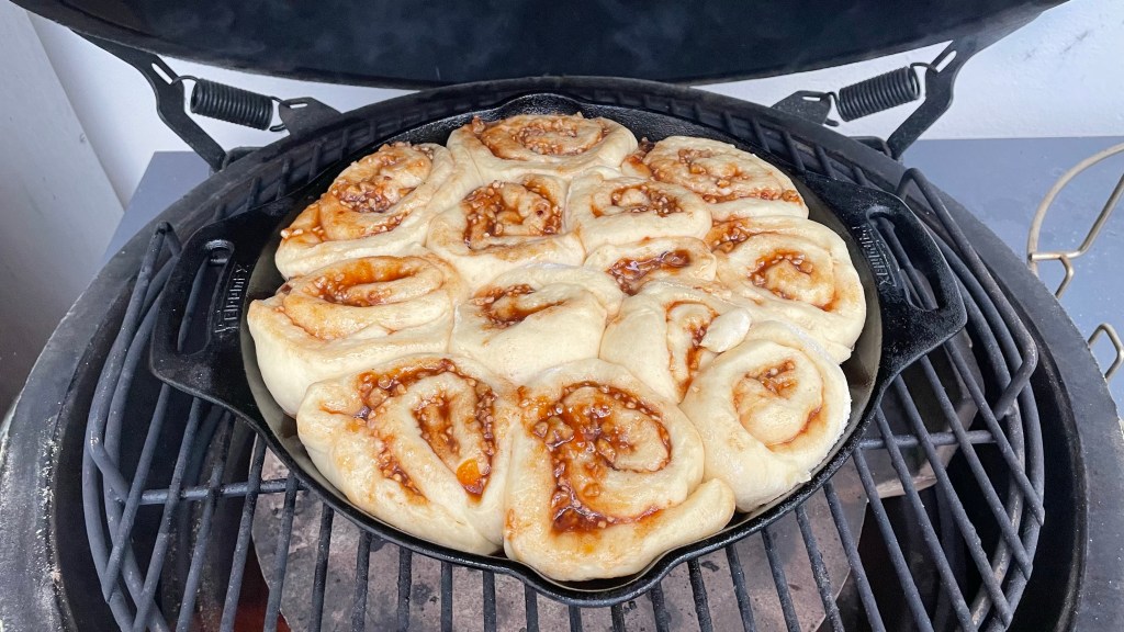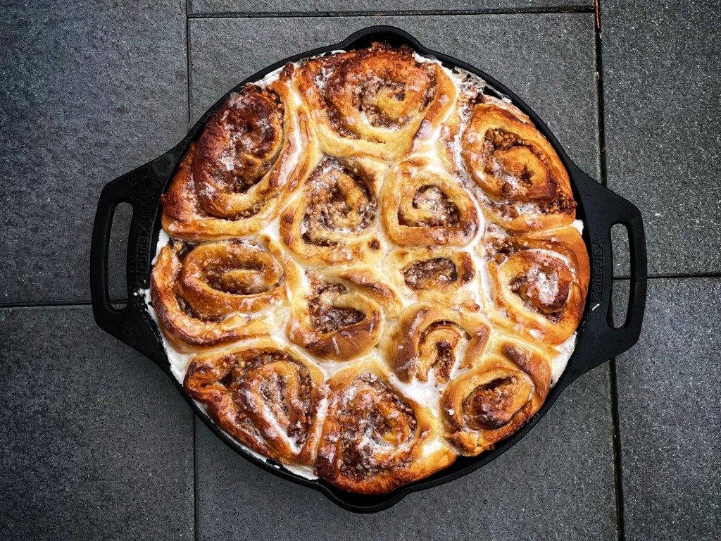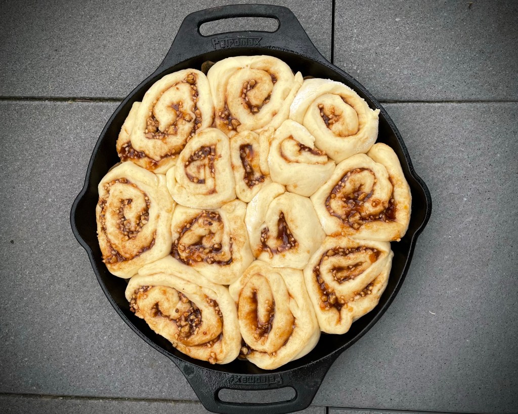 Duftende Zimtschnecken vom Grill, schön fluffig mit Nüssen und als Topping einen leckeren Zuckerguss. Na, wem läuft da auch das Wasser im Munde zusammen? Gebacken habe ich dieses süße Vergnügen auf dem Gig Green Egg Large in einer Petromax Gusspfanne FP30. Hier also mein Rezept für superfluffige Zimtschnecken.
