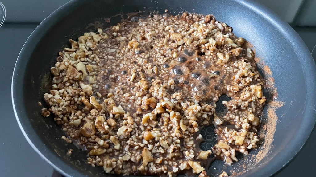 Für die Füllung: 3/4 des braunen Zuckers mit 1/3 des Zimts und einem Schuss Wasser in einer Pfanne erhitzen. Nüsse dazugeben und unter Rühren bei hoher Hitze etwa 3 Minuten karamellisieren.